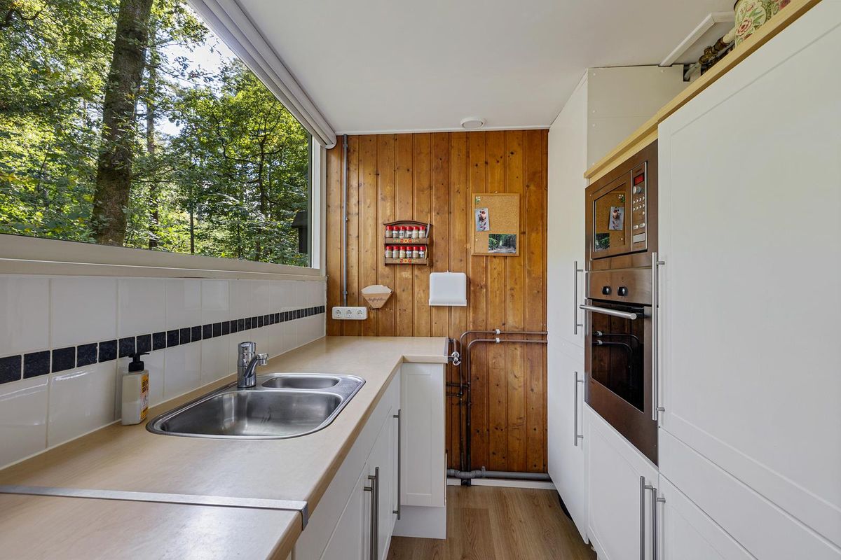 De keuken is praktisch ingericht en uitgerust met een spoelbak, een 5-pits gasstel, een combi-oven/magnetron en een koelkast.
