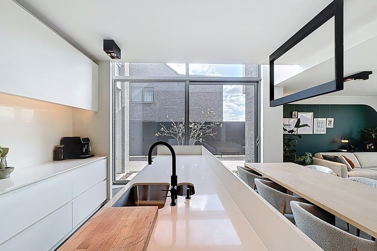 Doorheen de woning zorgen hoogwaardige materialen, massieve eiken vloeren en een keramische tegelvloer die doorloopt naar het terras voor een tijdloze en duurzame uitstraling. De open keuken is volledig uitgerust met een composiet werkblad, kookeiland, Miele toestellen en een Quooker.