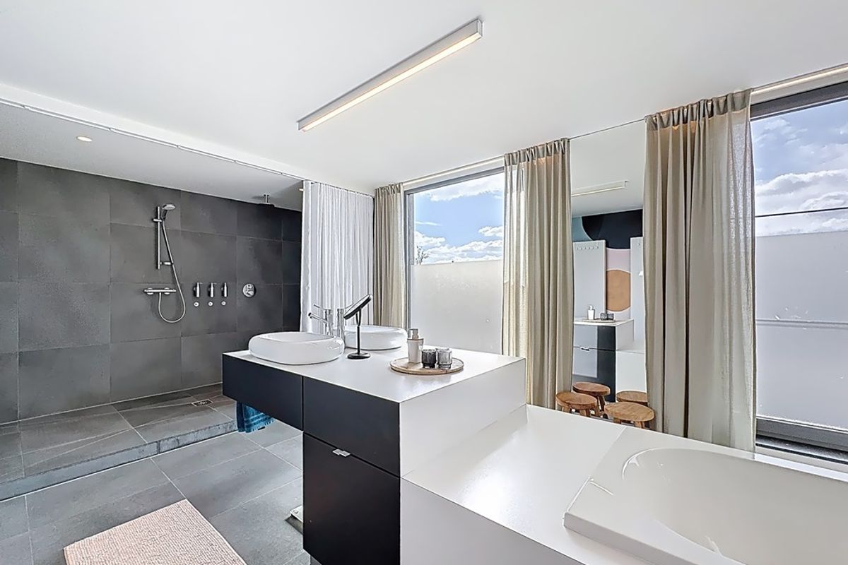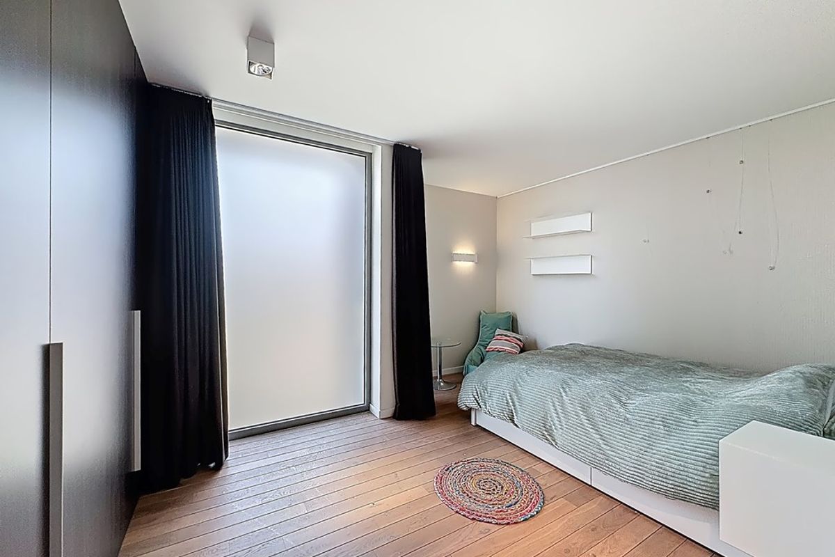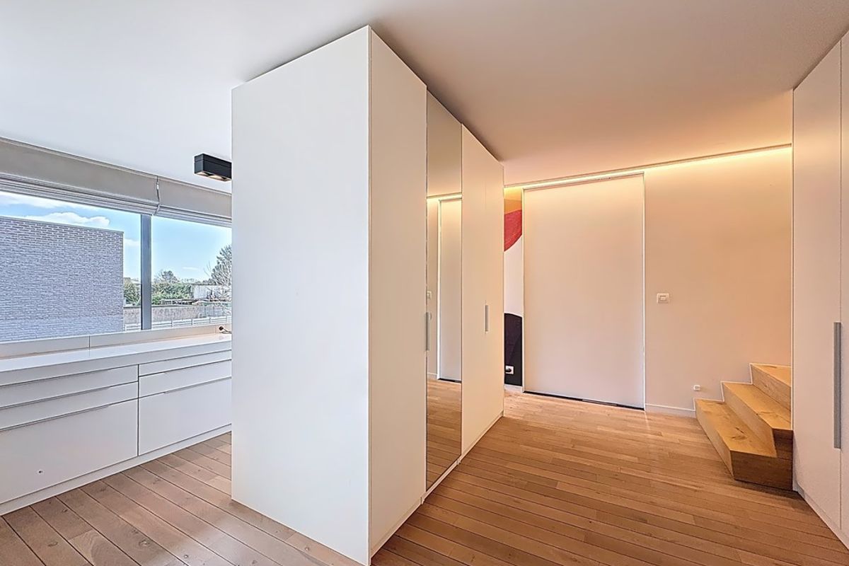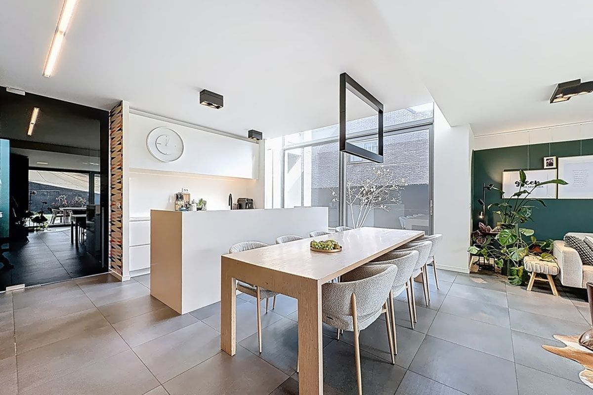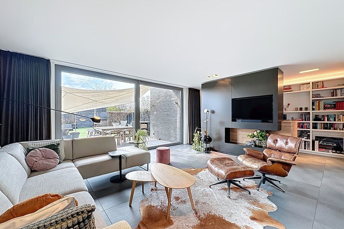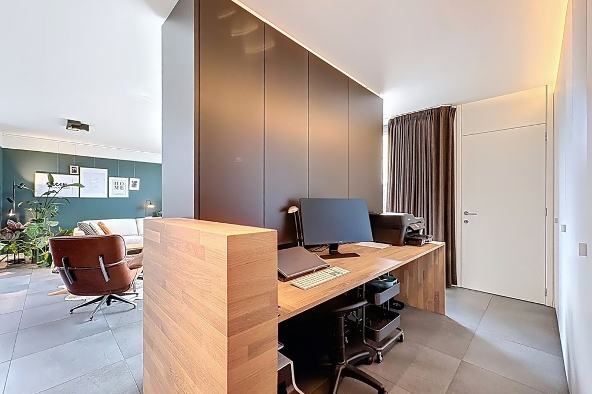 De leefruimte baadt in natuurlijk daglicht dankzij de hoge raampartijen en de volledig openende achtergevel. Maatwerkmeubilair, van vestiaire tot bibliotheek, bureau, tv-meubel en ingerichte wasplaats, vormt één harmonieus geheel met zorgvuldig gekozen raamdecoratie en designverlichting. Ook op de verdieping vind je dezelfde hoogwaardige afwerking terug, met dressingkasten, een flexibele bureauruimte op de overloop en een volledig ingerichte badkamer met maatwerk.