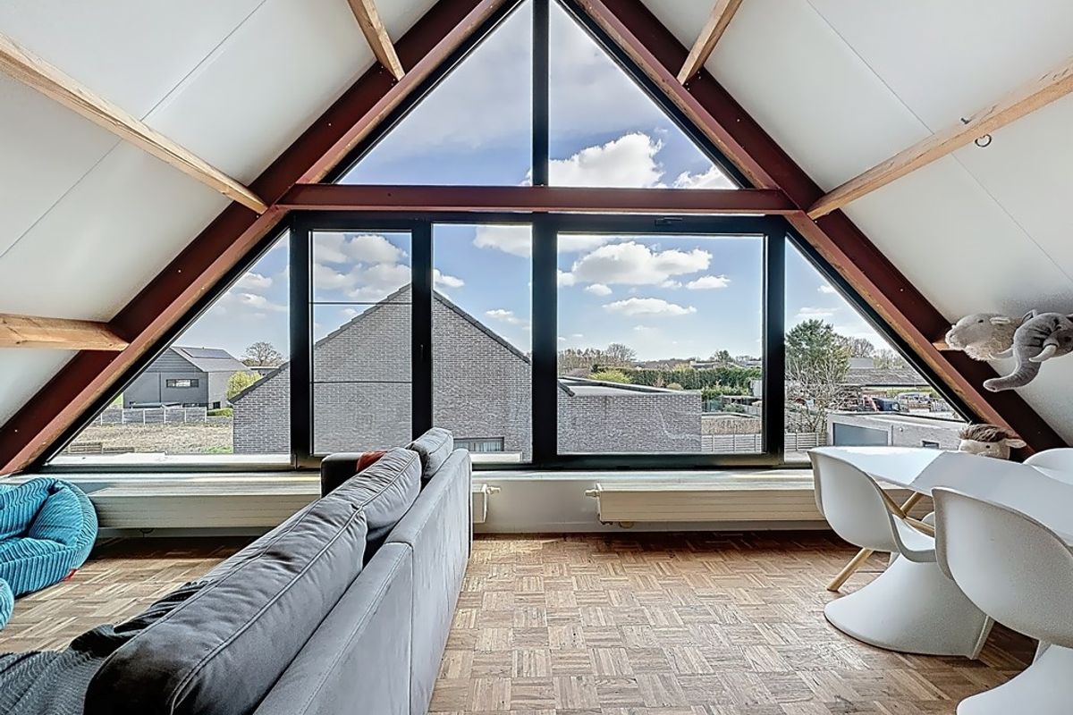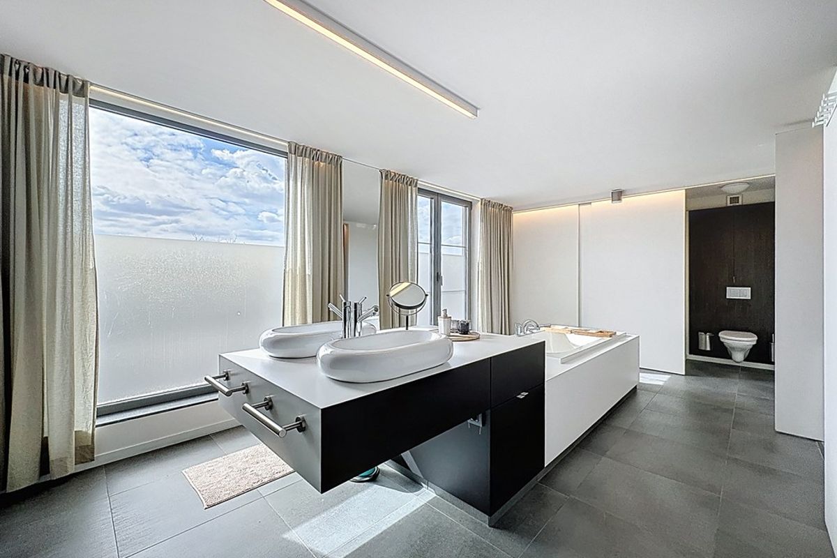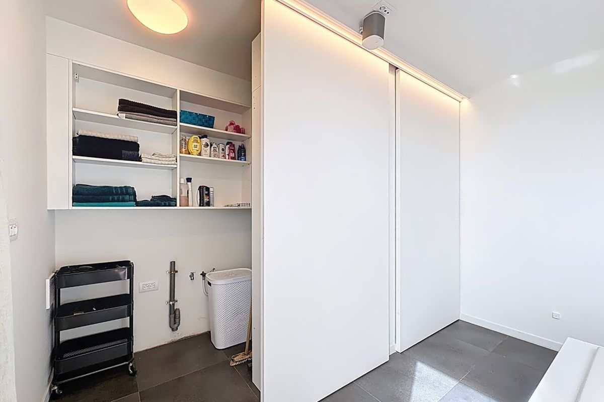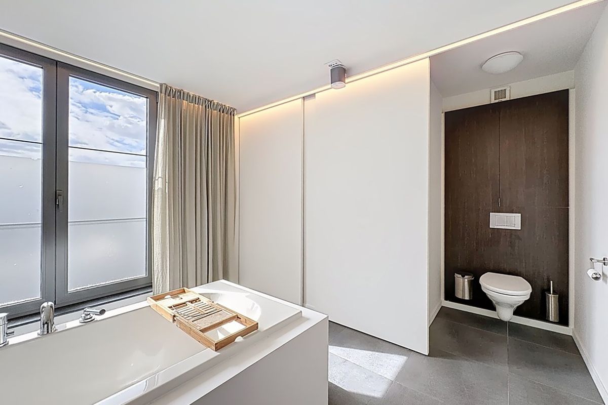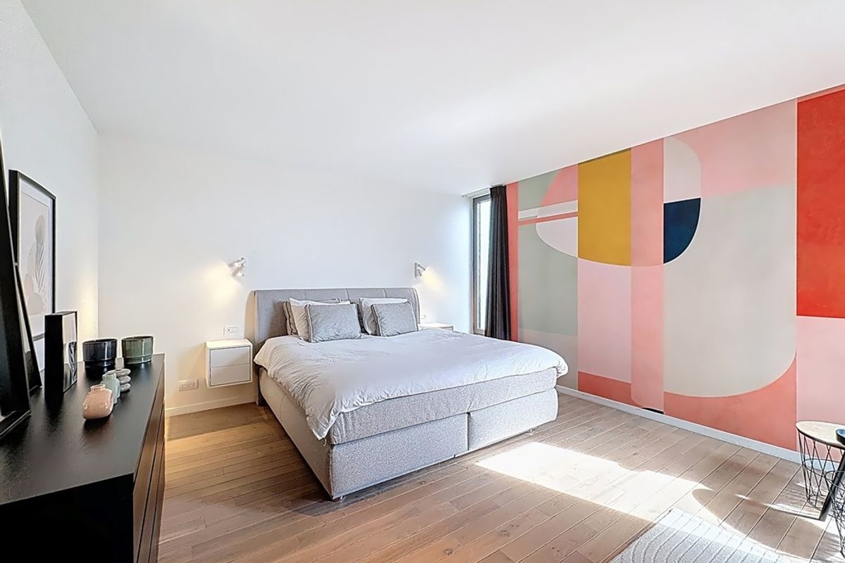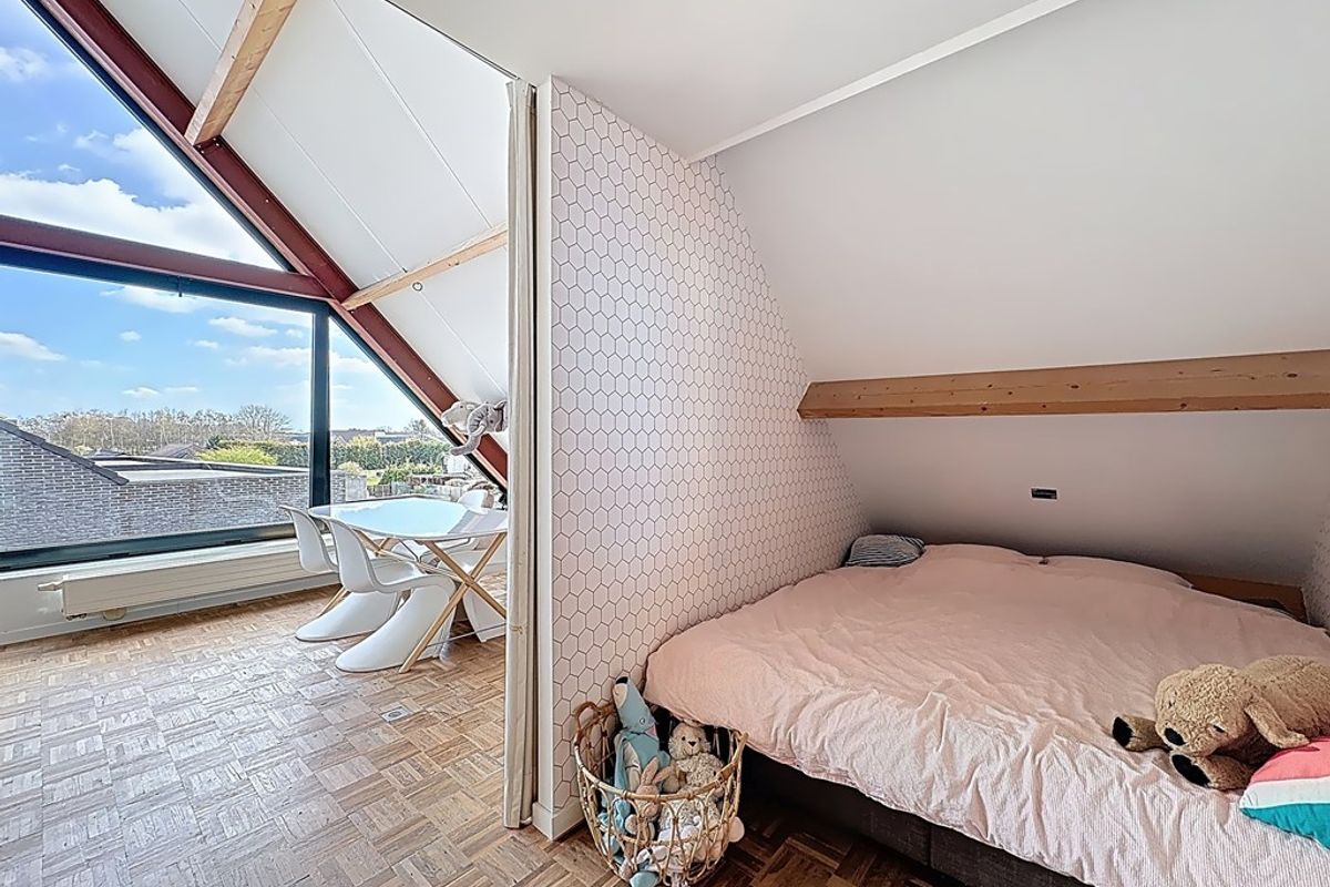 De leefruimte baadt in natuurlijk daglicht dankzij de hoge raampartijen en de volledig openende achtergevel. Maatwerkmeubilair, van vestiaire tot bibliotheek, bureau, tv-meubel en ingerichte wasplaats, vormt één harmonieus geheel met zorgvuldig gekozen raamdecoratie en designverlichting. Ook op de verdieping vind je dezelfde hoogwaardige afwerking terug, met dressingkasten, een flexibele bureauruimte op de overloop en een volledig ingerichte badkamer met maatwerk.