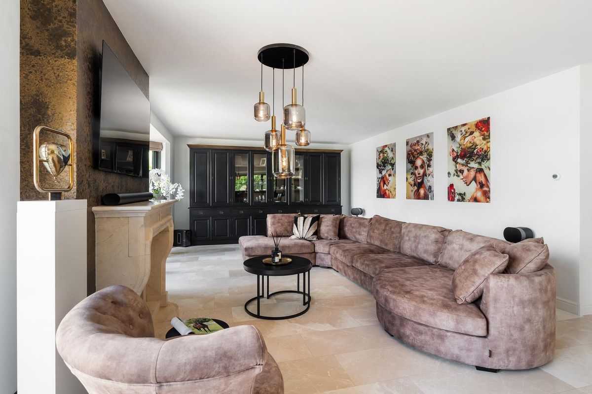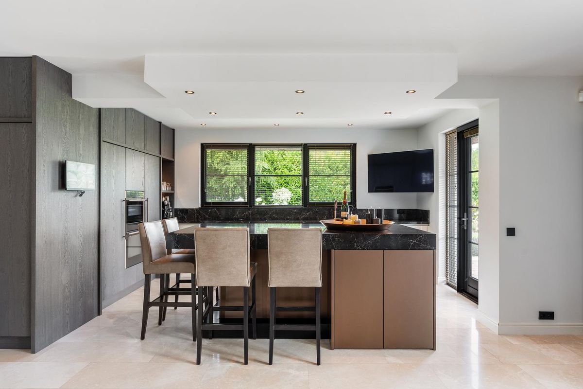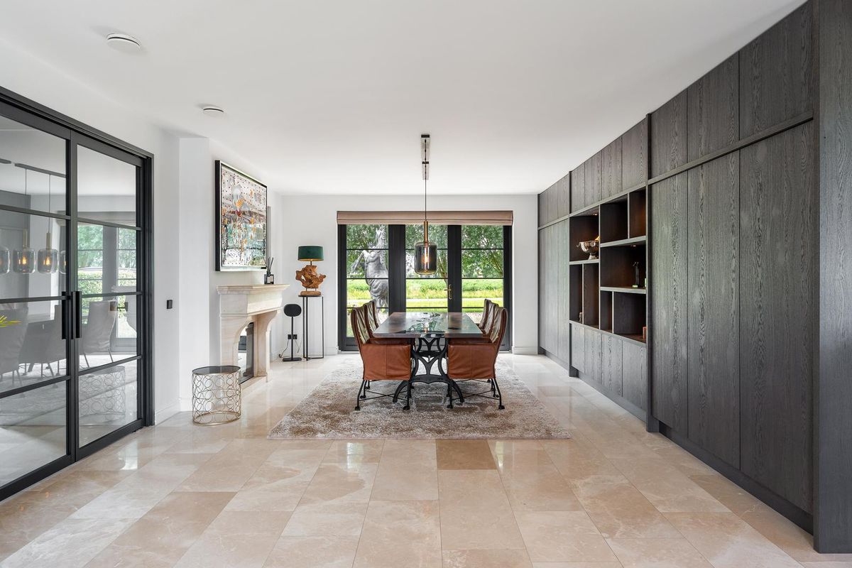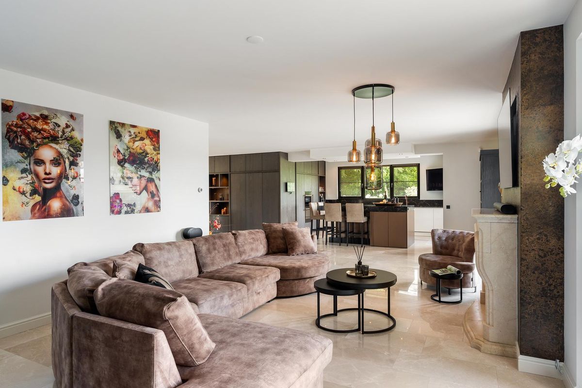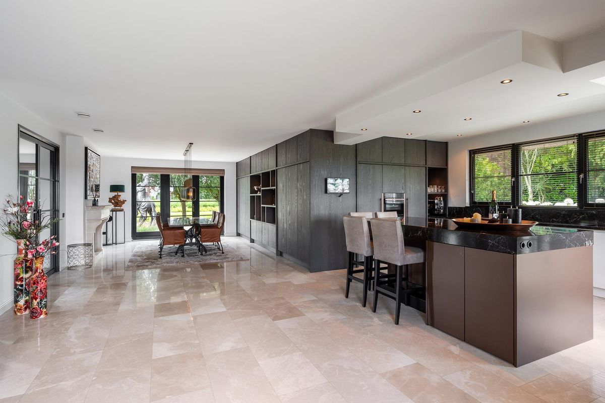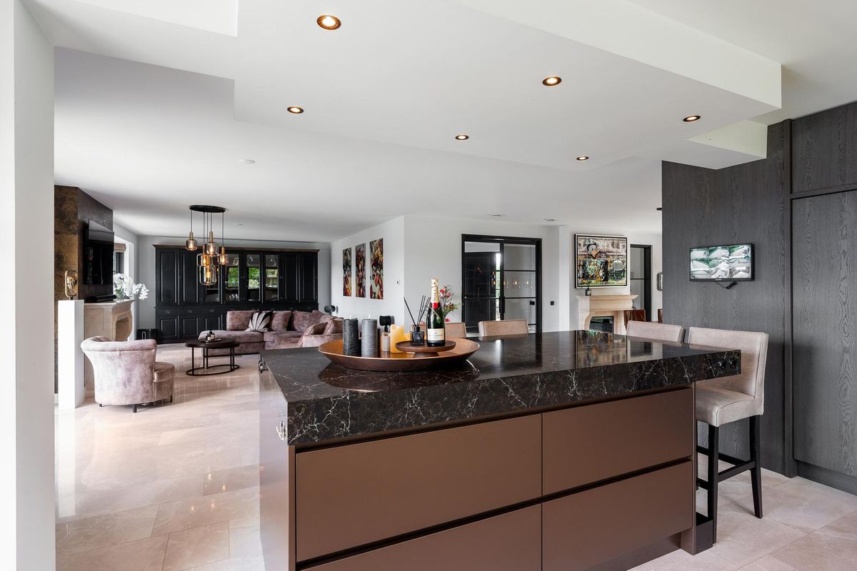 De villa is gebouwd met hoogwaardige materialen en beschikt over een ruime woonkamer met marmeren schouw en vloeren. De moderne open keuken is uitgerust met twee koel-vriescombinaties, stoomoven, oven, vaatwasser, Quooker en een Bora-kookplaat met geïntegreerde afzuiging.