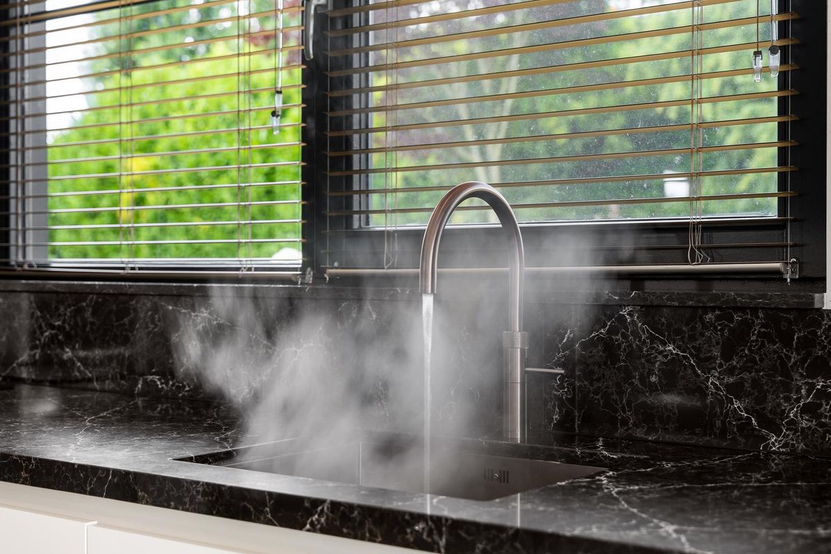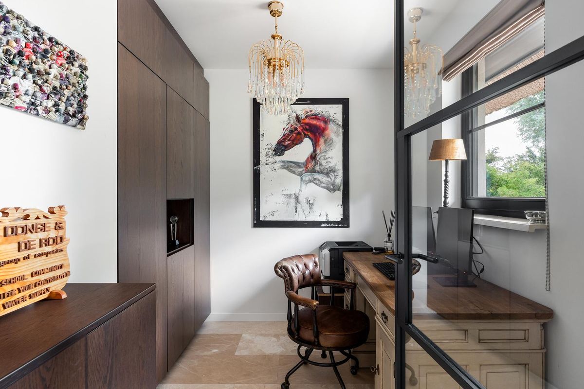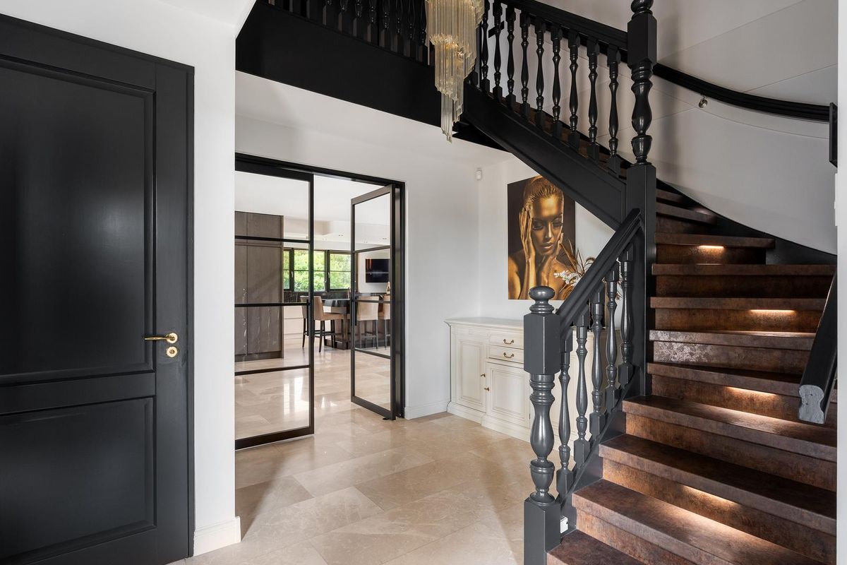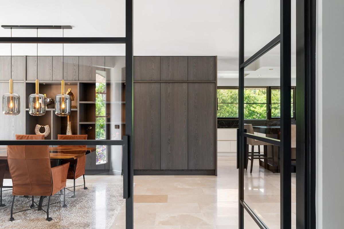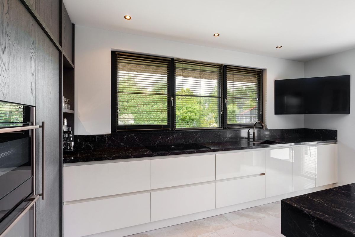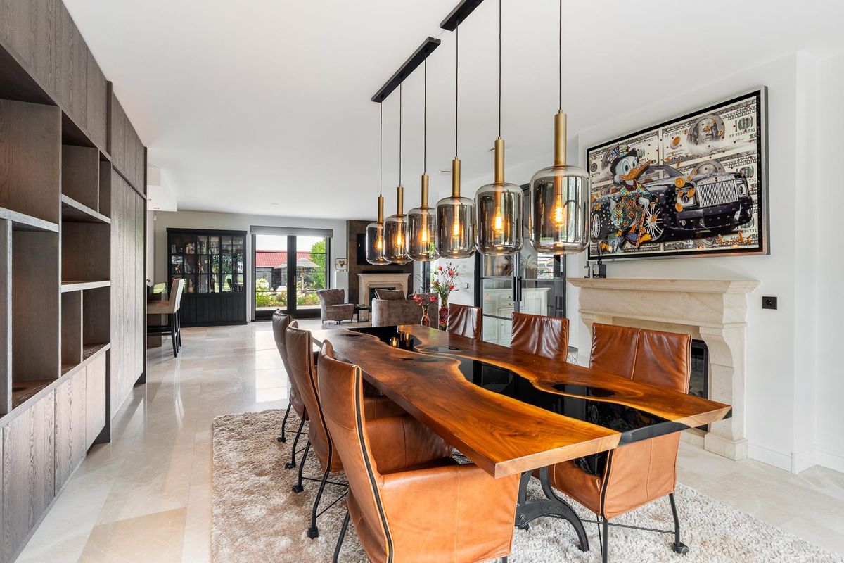 De villa is gebouwd met hoogwaardige materialen en beschikt over een ruime woonkamer met marmeren schouw en vloeren. De moderne open keuken is uitgerust met twee koel-vriescombinaties, stoomoven, oven, vaatwasser, Quooker en een Bora-kookplaat met geïntegreerde afzuiging.