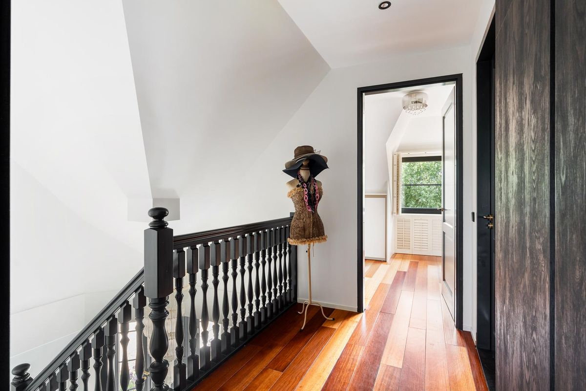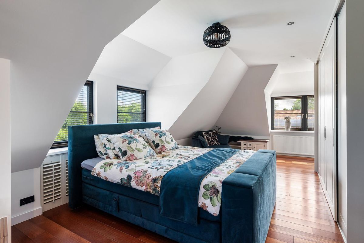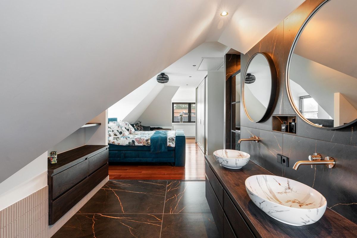 Op de eerste verdieping bevinden zich twee slaapkamers en een luxe badkamer en suite, uitgerust met een ligbad, inloopdouche en dubbele wastafel. Daarnaast is er een separate wasruimte aanwezig. De afwerking is hoogwaardig, met massief kersenhouten vloeren, vloerverwarming en strak gestuukte plafonds.