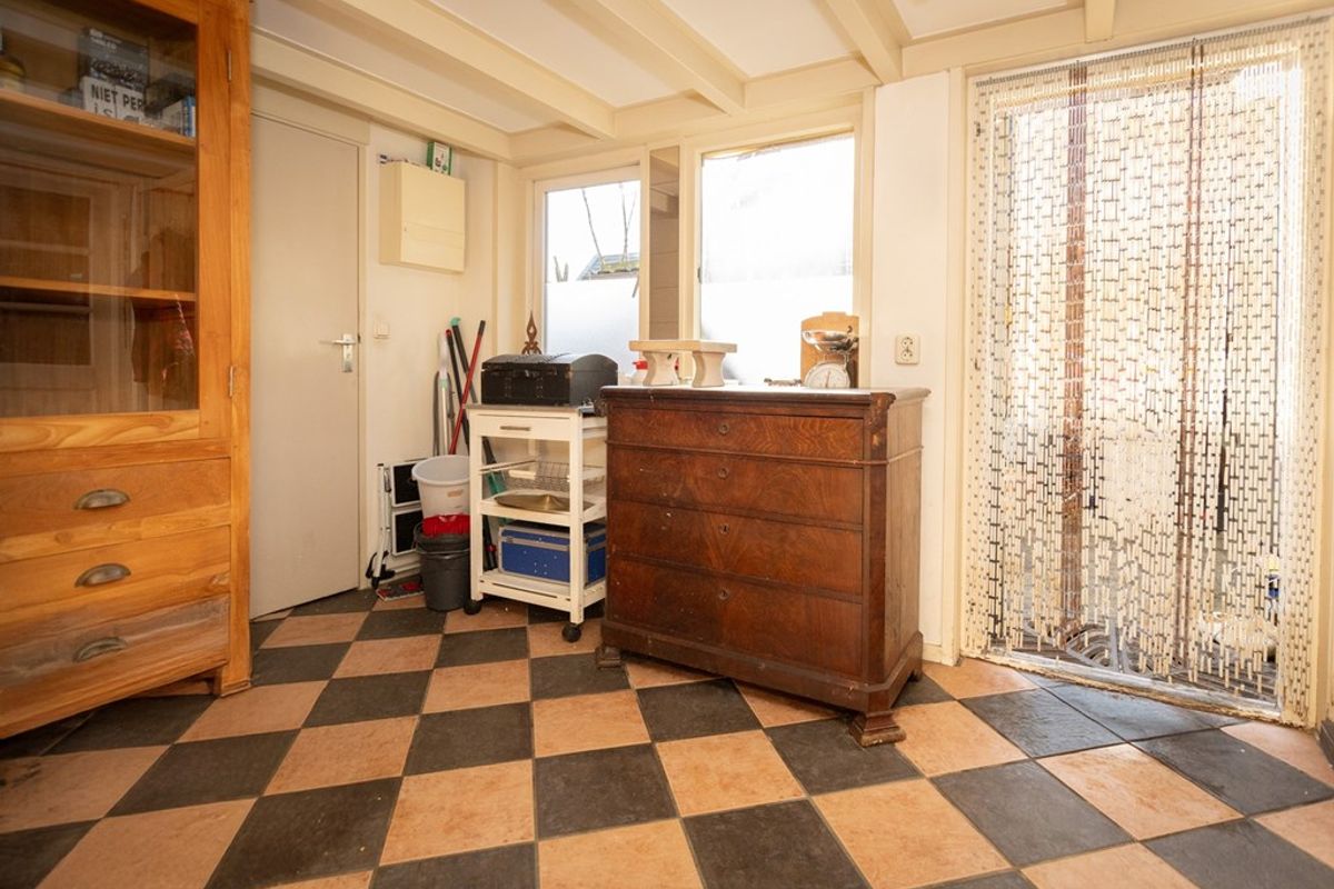 Via de entree met trapopgang kom je in de gezellige straatgerichte woonkamer met erker die overgaat in de achterkamer met daar aan vast de open keuken met kelderkast. Vanuit de keuken kom je in de ruime bijkeuken met achterentree en tenslotte kom je in de badkamer met douche, toilet en wastafel.