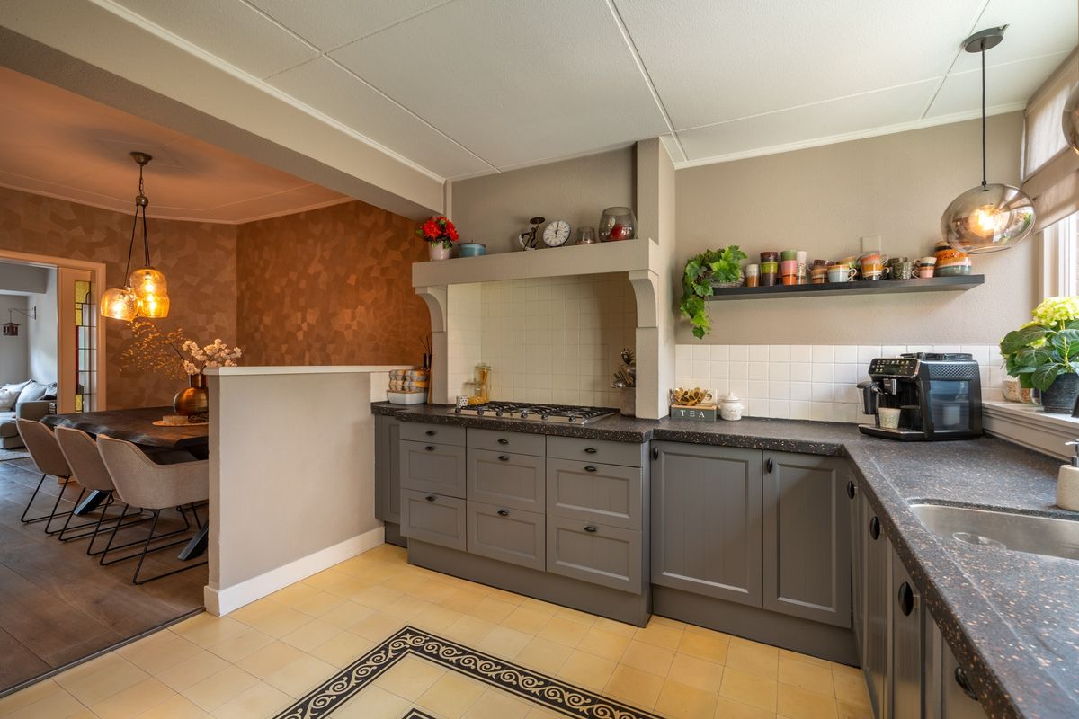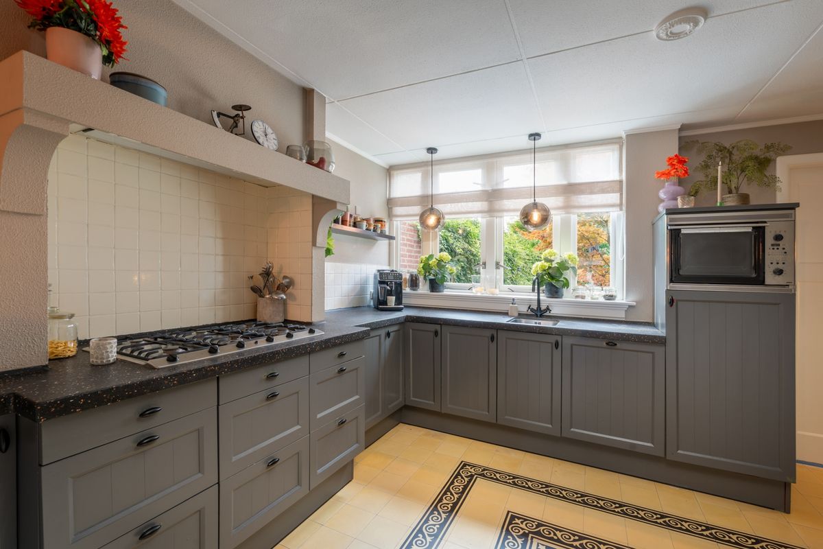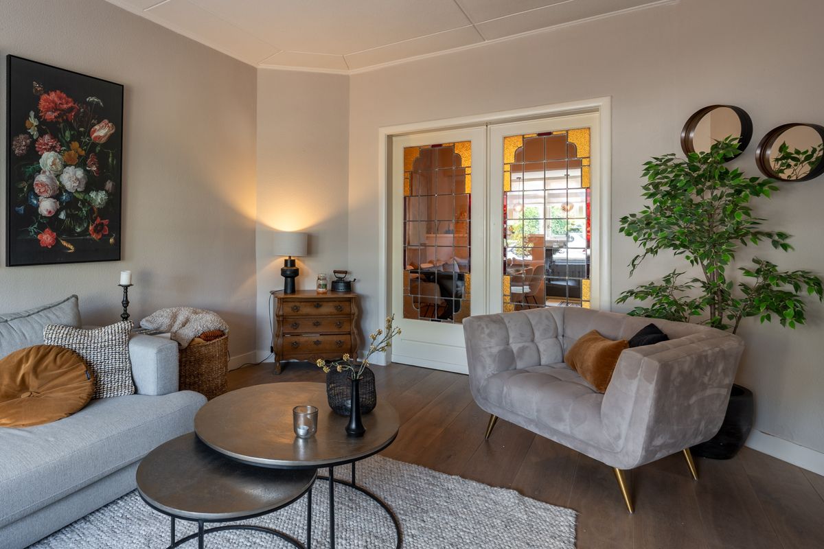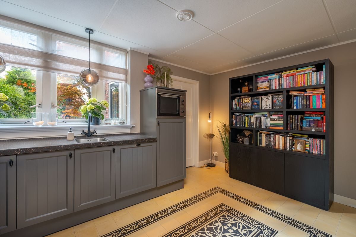 Via de hal/entree met originele granitovloer, meterkast, kelderkast, toilet en trapopgang naar de eerste etage komt u in de lichte woon- en eetkamer met parketvloer. De sfeervolle ensuite-deuren met glas-in-lood zorgen voor een mooie verbinding tussen de twee ruimtes. De open keuken is o.a. voorzien van een 6-pits gaskookplaat, magnetron/oven, vaatwasser, afzuigkap, koelkast en stijlvol terrazzo werkblad. Achter de keuken bevindt zich de bijkeuken met witgoedaansluitingen, welke keurig zijn weggewerkt achter een vaste kast.