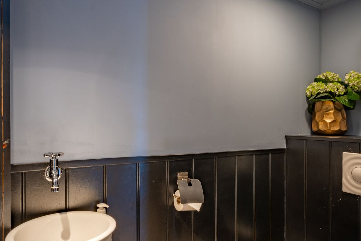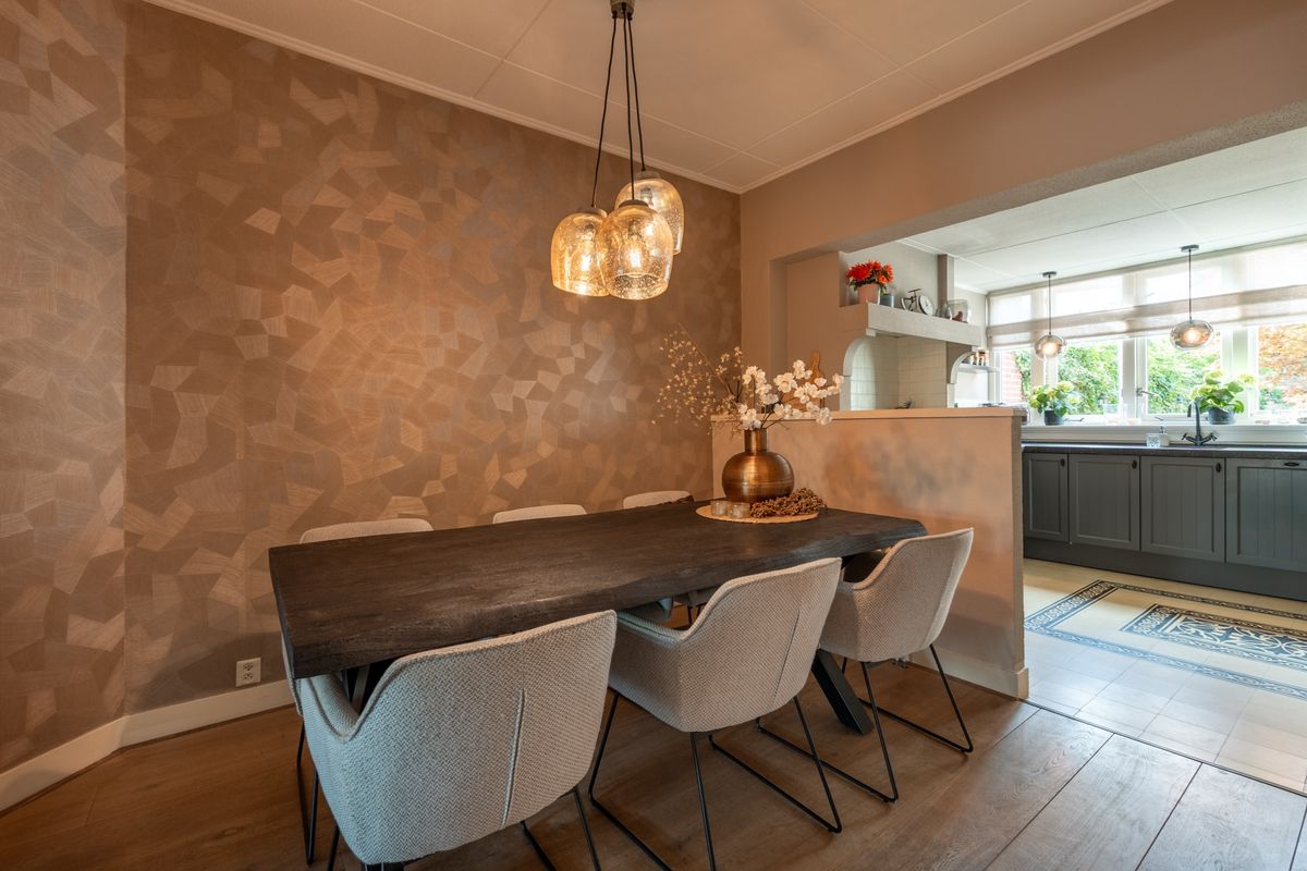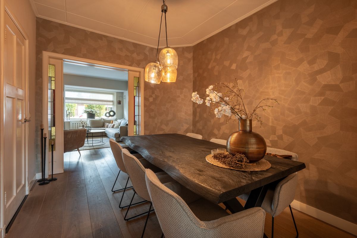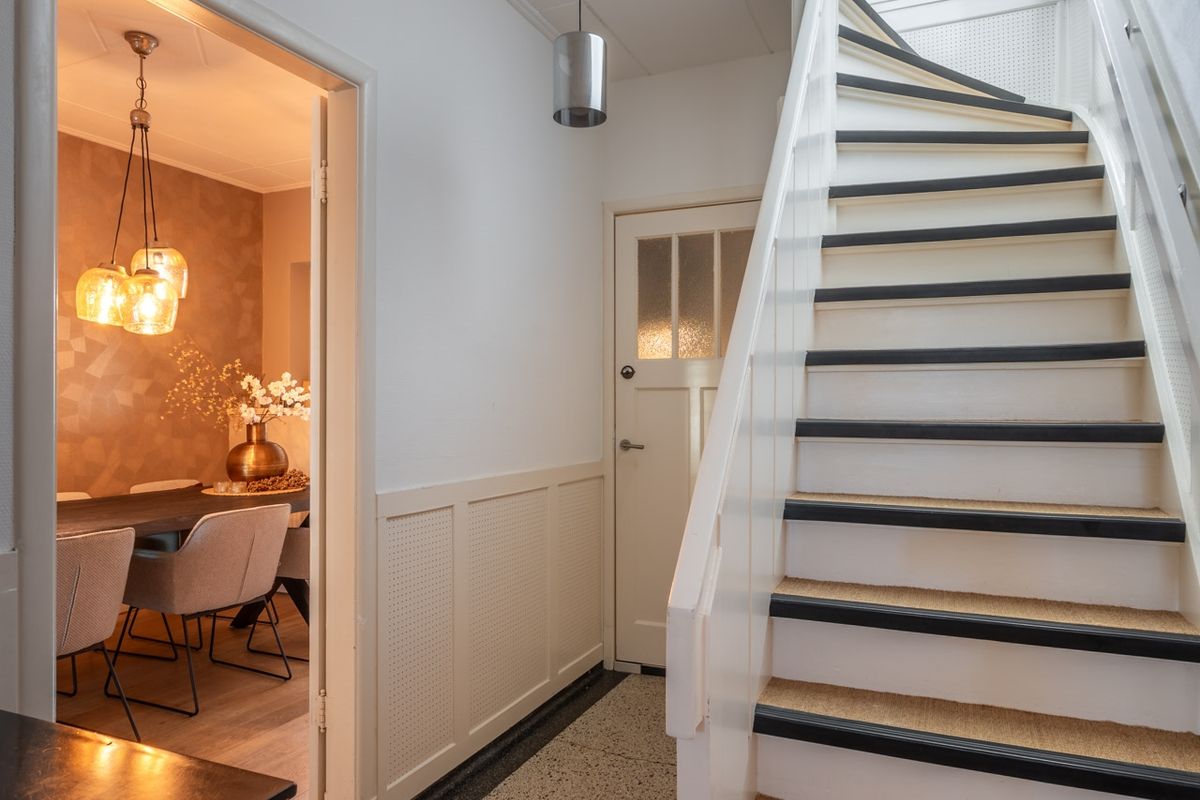 Via de hal/entree met originele granitovloer, meterkast, kelderkast, toilet en trapopgang naar de eerste etage komt u in de lichte woon- en eetkamer met parketvloer. De sfeervolle ensuite-deuren met glas-in-lood zorgen voor een mooie verbinding tussen de twee ruimtes. De open keuken is o.a. voorzien van een 6-pits gaskookplaat, magnetron/oven, vaatwasser, afzuigkap, koelkast en stijlvol terrazzo werkblad. Achter de keuken bevindt zich de bijkeuken met witgoedaansluitingen, welke keurig zijn weggewerkt achter een vaste kast.