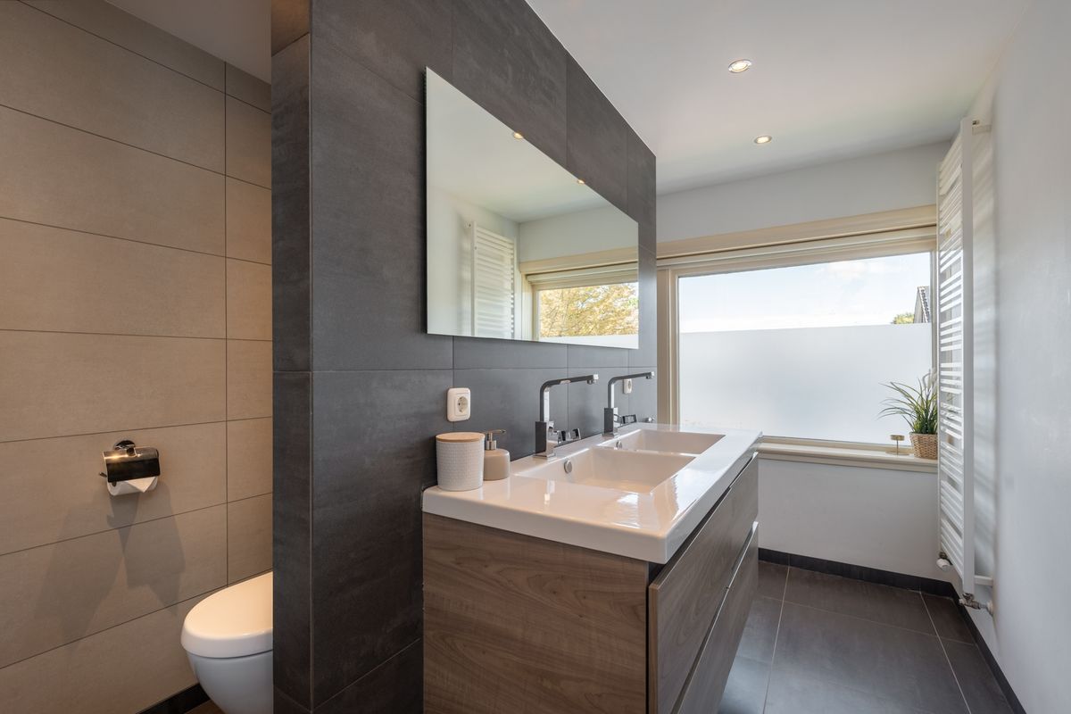 De overloop biedt toegang tot twee ruime slaapkamers, beide met vaste kastruimte. De badkamer is modern afgewerkt en beschikt over een inloopdouche, dubbele wastafel, vloerverwarming en toilet. Tevens is er een vaste kast op de overloop en toegang tot een fijn dakterras.