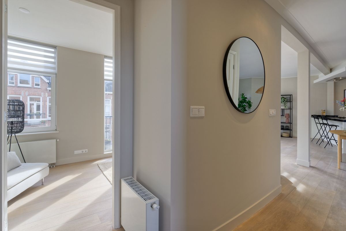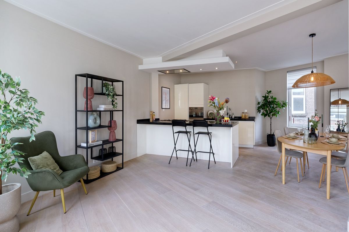 Vanaf de straat via het gemeenschappelijke trappenhuis naar de derde verdieping, toegang tot het appartement middels de ruime hal met garderobekast en gastentoilet. De royale woonkamer met open keuken is zeer licht door de vele raampartijen die op het zuiden gericht zijn. Verder zijn er openslaande deuren naar het frans balkon wat een verlenging van de woonkamer geeft. Aan de noordzijde bevindt zich nog een balkon.