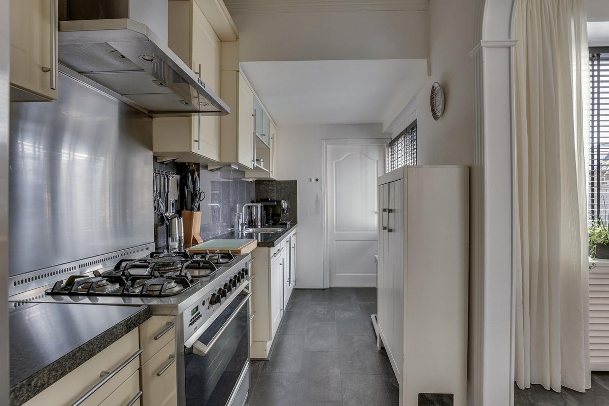 De woning beschikt over een knusse woonkamer met parketvloer en aan de voorzijde een karakteristieke erker die zorgt voor extra lichtinval en sfeer. Aan de achterzijde bevindt zich een tuingerichte eetkamer, met directe toegang tot de open keuken, voorzien van inbouwapparatuur en een granieten werkblad. De achtergelegen bijkeuken is praktisch ingericht met CV-ketel (2023) en witgoedaansluitingen.