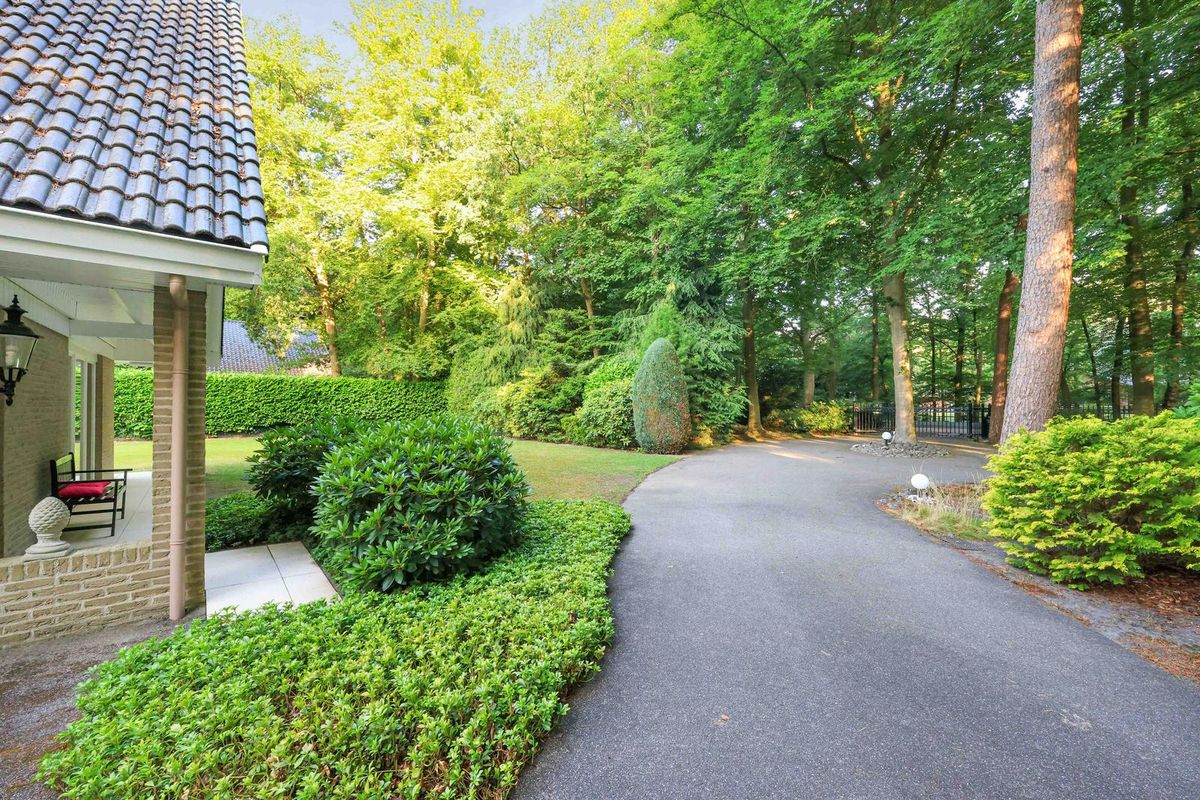 De elektrisch bedienbare toegangspoort verleent toegang tot de oprijlaan met aan de linkerzijde een carport/berging.