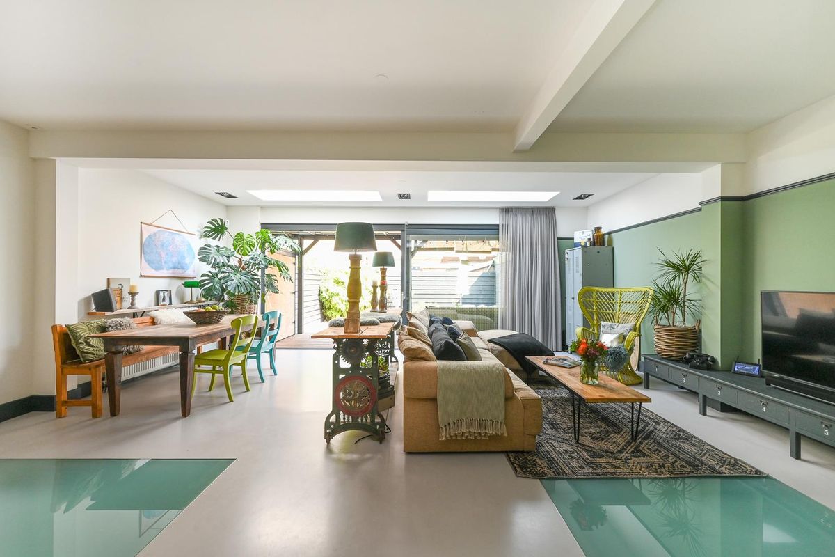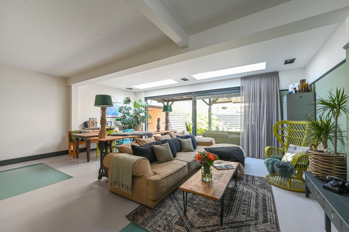Bij binnenkomst in de woonkamer ervaar je direct een wow-moment door de enorme lichtinval dankzij de aanbouw met lichtkoepels en grote schuifpui naar de achtertuin. De strakke gietvloer sluit naadloos aan op de gestucte wanden en plafonds en geeft de ruimte een moderne en luxe uitstraling. In een keurig weggewerkte kast vind je de cv-ketel (ATAG 2019) en de unit voor mechanische ventilatie.