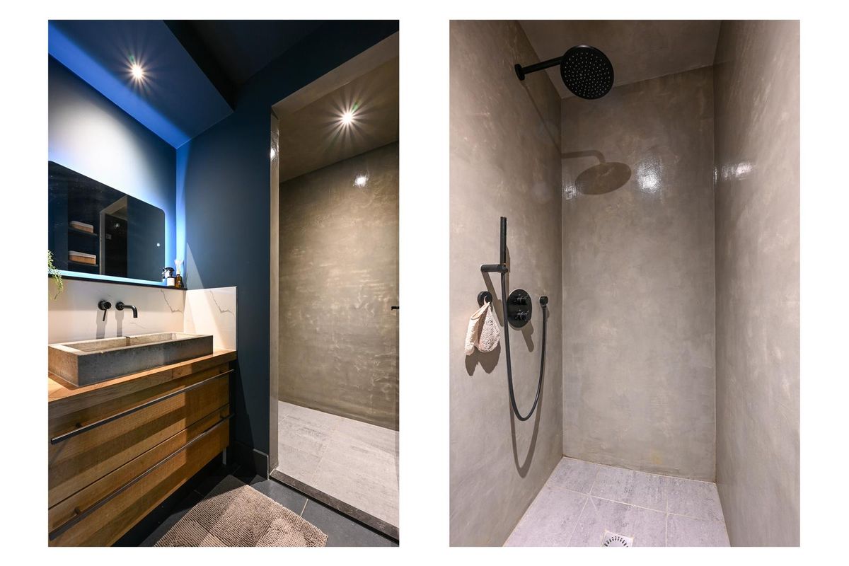 De badkamer straalt pure luxe uit met strak betoncire, een riante douchegelegenheid, breed wasmeubel en elegante inbouwkranen.