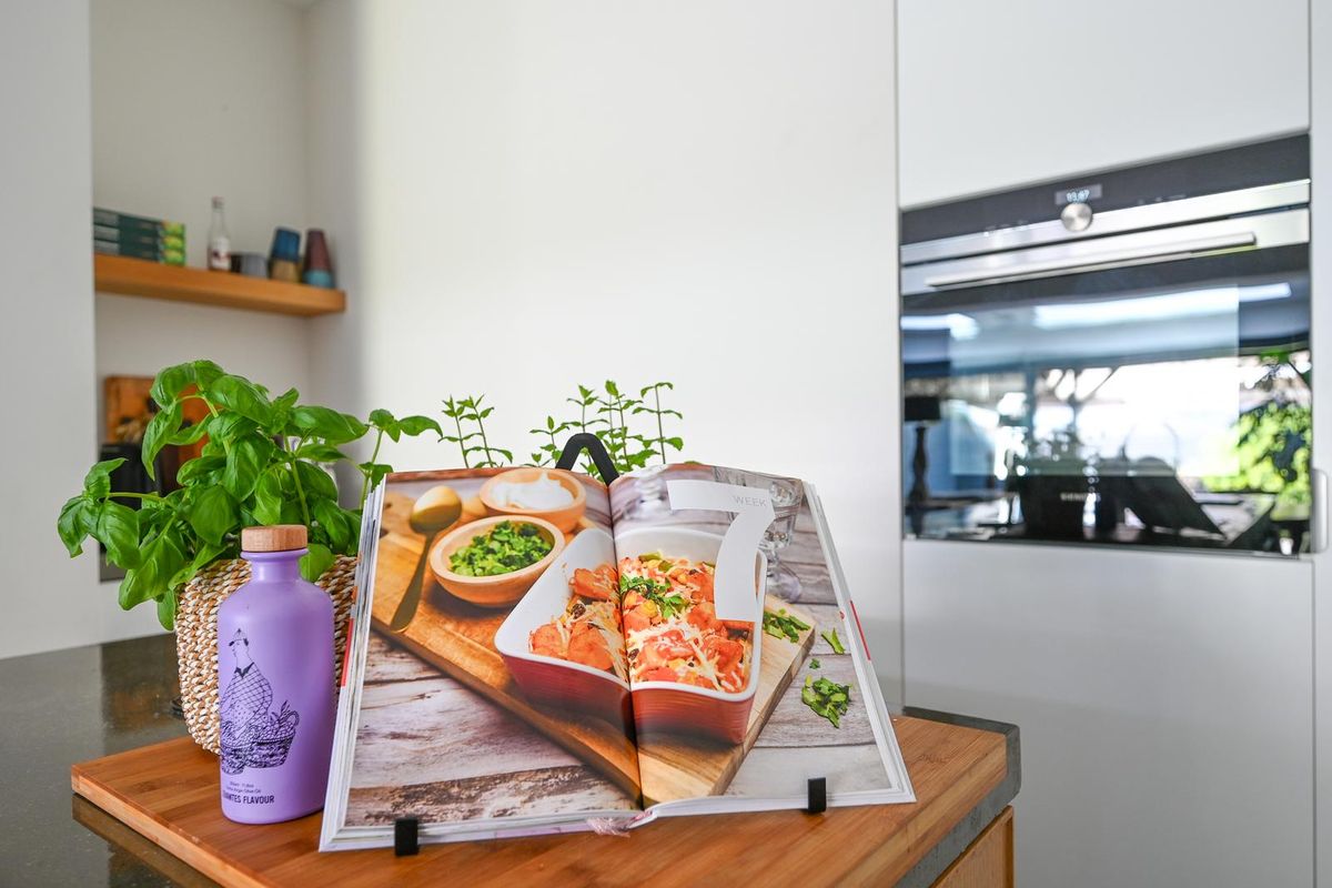 De royale woonkeuken met kookeiland is een plek waar koken en gezelligheid samenkomen. Uitgerust met hoogwaardige inbouwapparatuur zoals een Siemens inductiekookplaat met stijlvolle Klarstein downdraft afzuiging, combi-oven, vaatwasser, koelkast met vriesvak en een handige nis voor de koffiecorner. Extra praktisch zijn de stopcontacten in het werkblad voor laptop of telefoon.