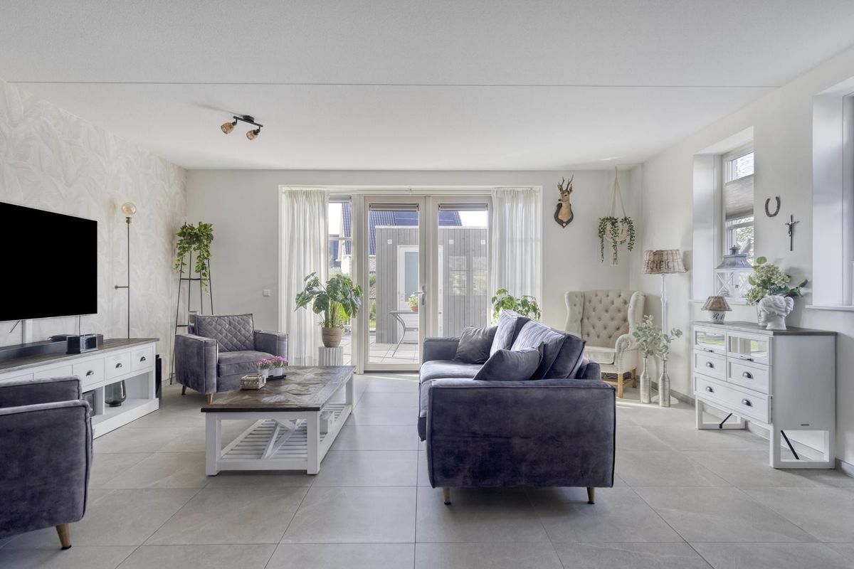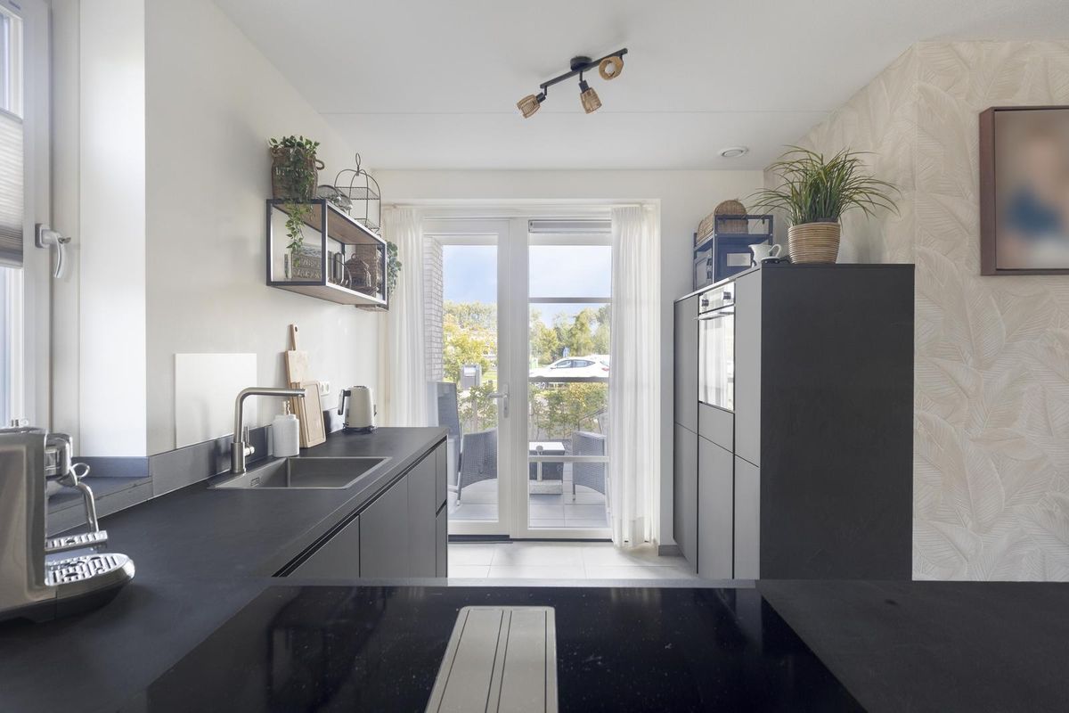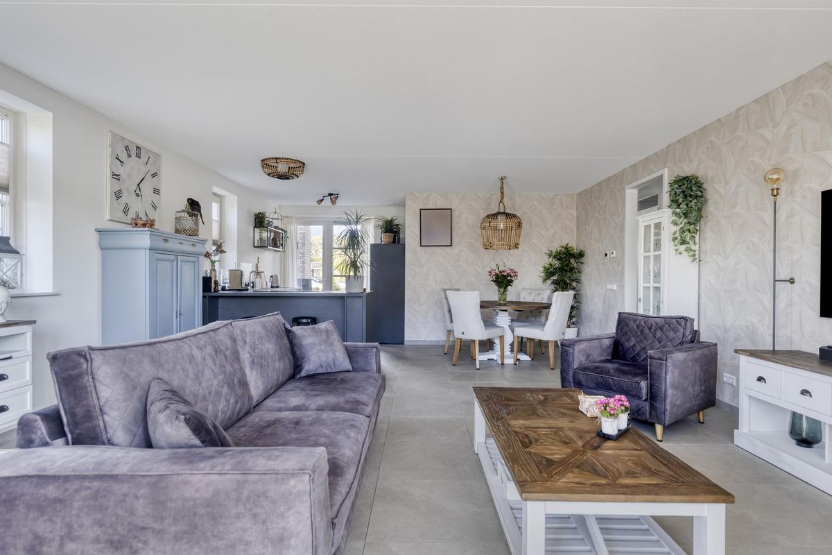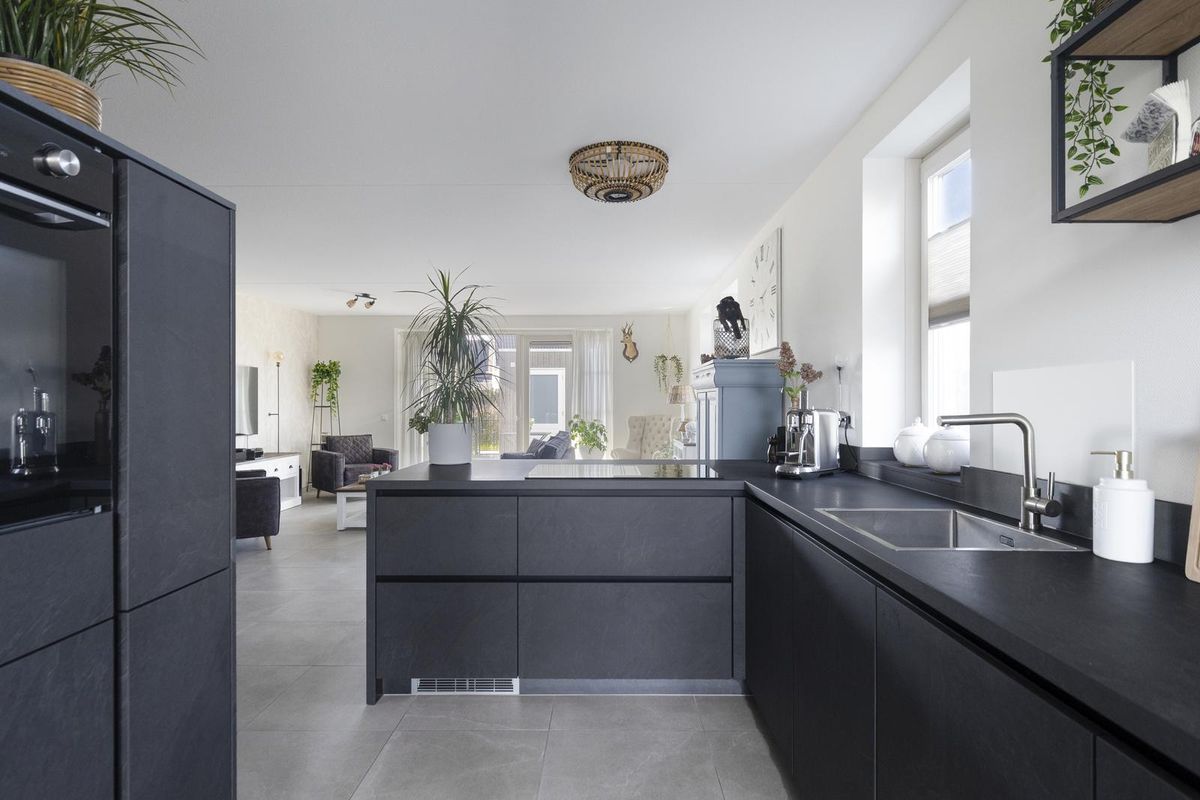 De royale woonkamer is aan de achterzijde van de woning gesitueerd en biedt via dubbele tuindeuren direct toegang tot het overdekte terras. Dankzij de grote raampartijen komt er veel daglicht binnen, wat bijdraagt aan een prettige woonsfeer. De moderne open keuken is strak afgewerkt en beschikt over diverse inbouwapparatuur zoals een inductiekookplaat, afzuigkap, koelkast, vriezer, oven en vaatwasser. Vanuit de keuken is er toegang tot het terras aan de voorzijde.