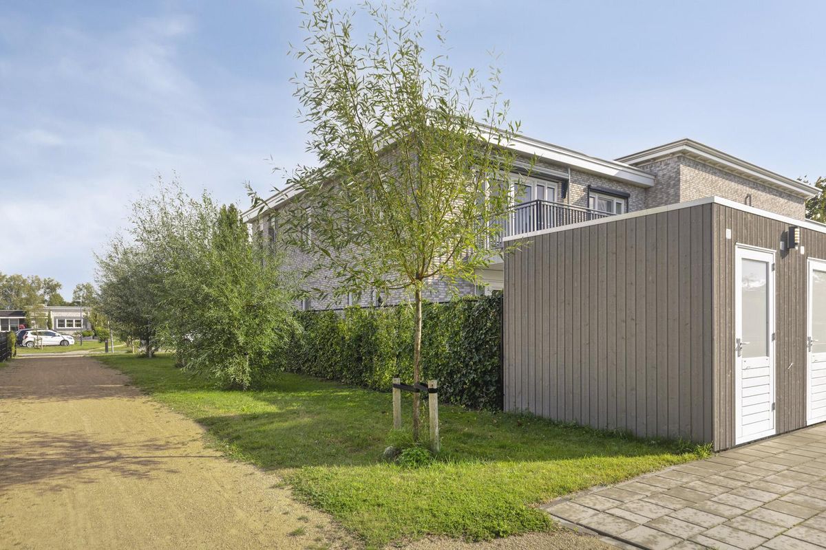De vrijstaande, onderhoudsvrije houten berging is voorzien van elektra en biedt volop ruimte voor fietsen, gereedschap en tuinmeubilair. Een achterom zorgt voor extra gemak en toegankelijkheid.