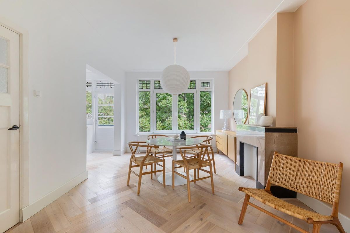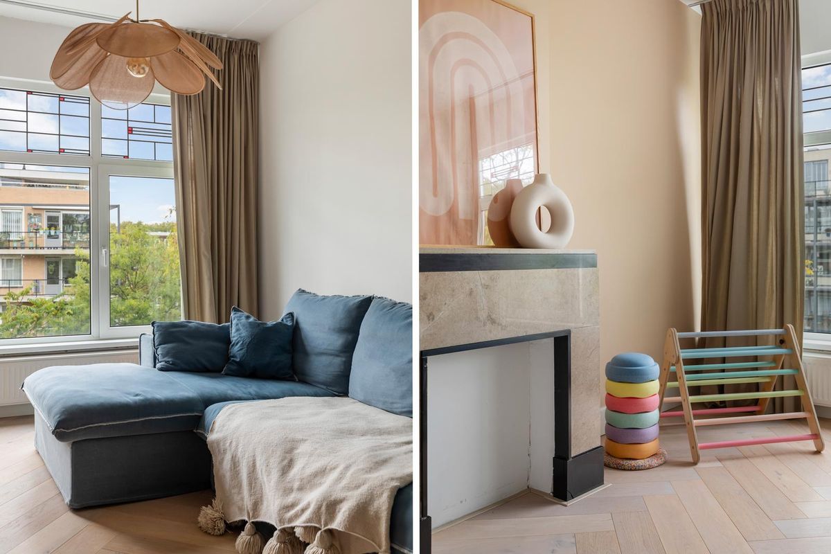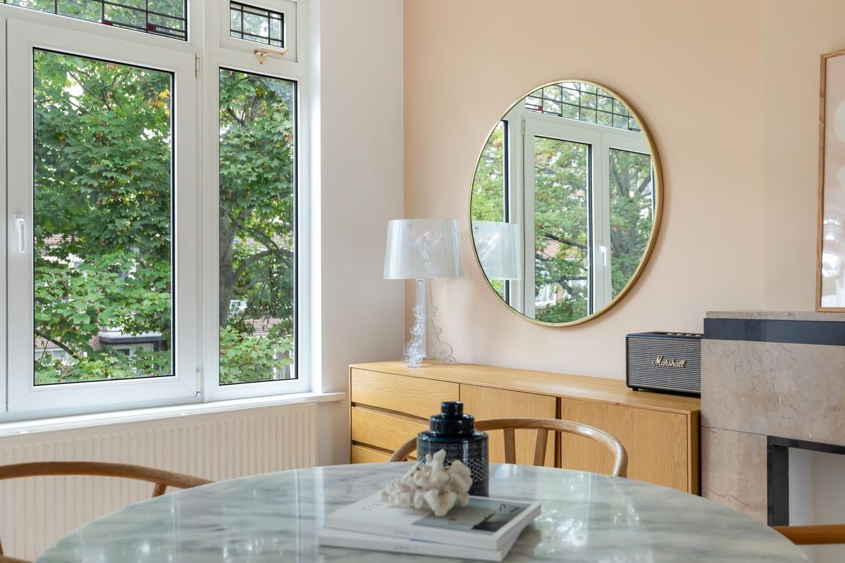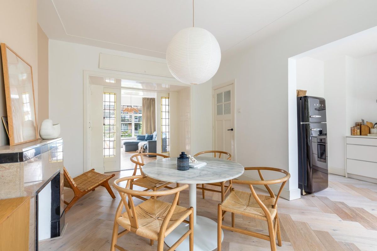 Ruime entree/hal met meterkast, toilet en toegang tot alle vertrekken. De royale en suite woonkamer is met een lengte van ruim 10 meter erg ruim te noemen. Direct wordt je overspoeld met prachtige jaren '30 details zoals het glas-in-lood en de paneeldeuren, wat de woning een zeer authentieke sfeer. Door de grote raampartijen treedt er veel natuurlijk licht de woning binnen, wat zorgt voor een fijne, lichte sfeer. Het woongedeelte wordt gescheiden van de eetkamer middels de en suite, met 3 inbouwkasten. Erg handig voor extra opbergruimte. De eetkamer heeft een directe verbinding met de half open keuken, die is voorzien van diverse inbouwapparatuur, zoals een 5-pits gasfornuis, oven, afzuigkap, vaatwasser en koelkast. De keuken biedt toegang tot het eerste balkon op het oosten. Hier kan je heerlijk van de ochtendzon genieten. De 1e slaapkamer wordt op dit moment gebruikt als inloopkast, maar is multifunctioneel in te richten.
