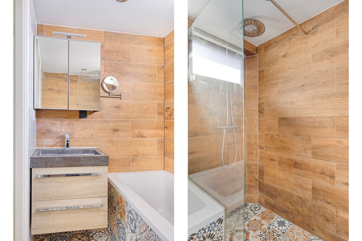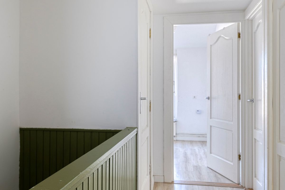 Overloop, 3 slaapkamers en badkamer met toilet, douche en wastafel.