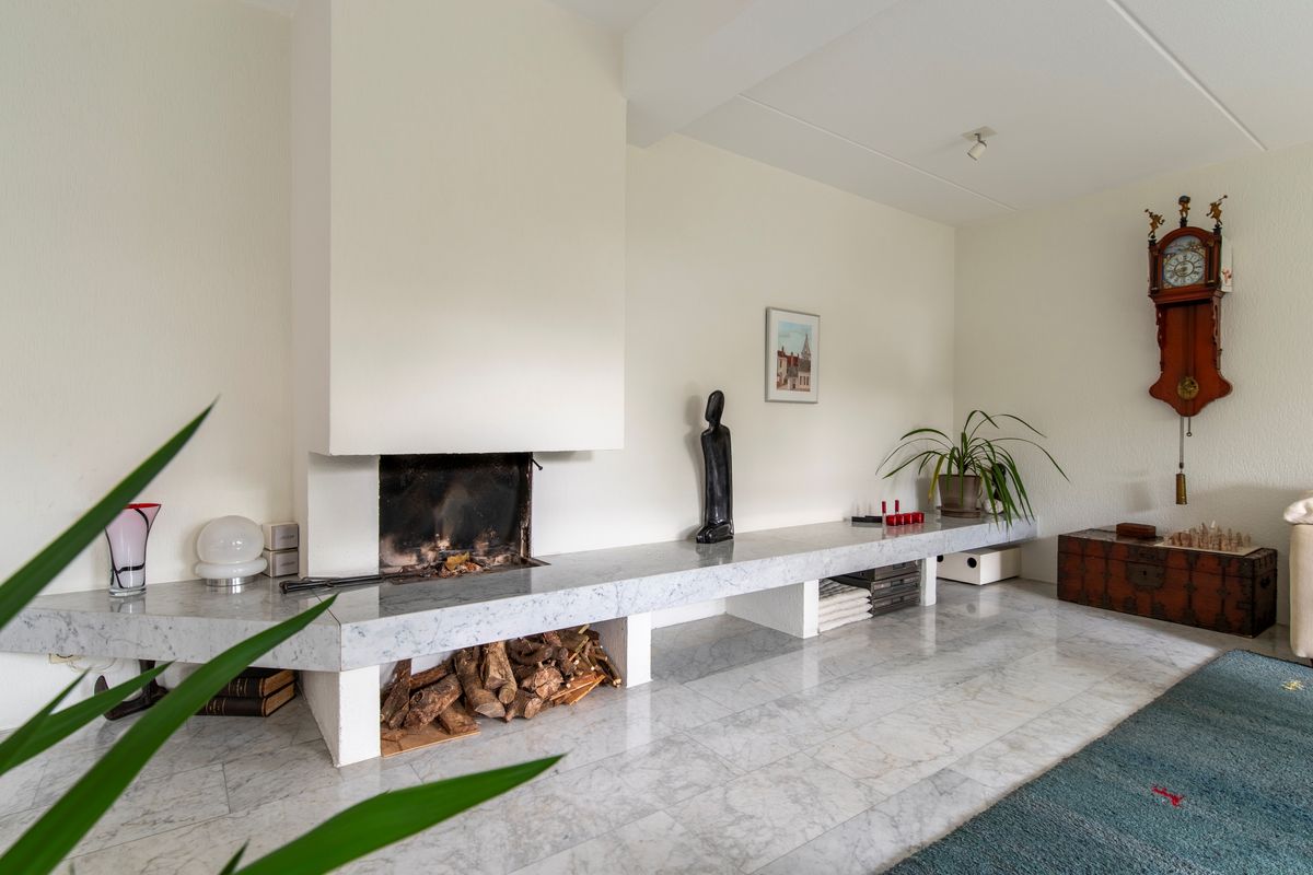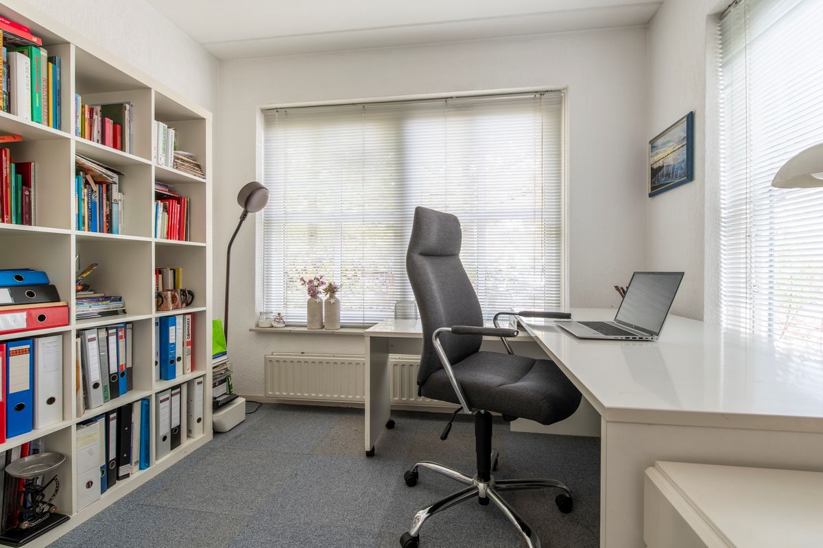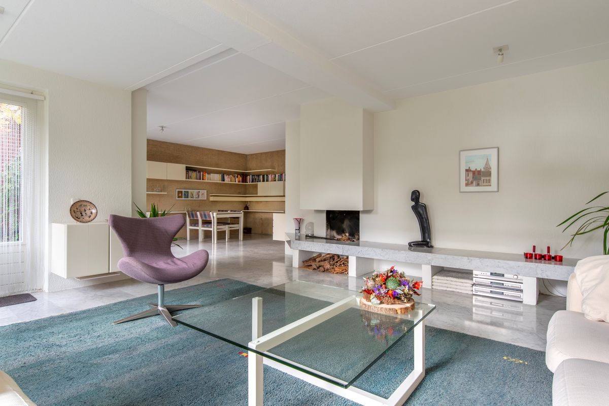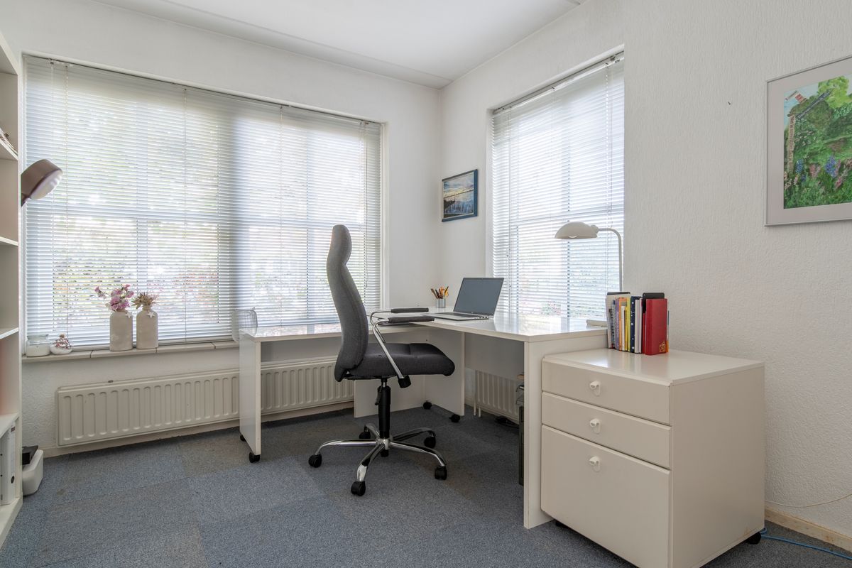 Begane grond: Via de extra brede oprit, met parkeergelegenheid voor meerdere auto's bereiken we de hal. Als eerste lopen we door naar de woonkamer. Deze fijne woonkamer heeft een schitterend zicht op de tuin. De naastgelegen eetkamer heeft meer dan voldoende ruimte voor het plaatsen van een eetkamertafel voor minimaal acht personen. Kortom, voldoende ruimte om hier urenlang te tafelen. De open haard bevindt zich strategisch tussen de woon- en eetkamer. De dichte keuken ligt aan de voorkant van het huis. De hier aanwezige, hoekopgestelde keukeninrichting is voorzien van een inductie kookplaat, een afzuigkap, een koelkast, een magnetron, een oven en een vaatwasser. Ook aanwezig is een apothekerskast. De werkkamer, die naast de keuken ligt, vraagt er om bij de keuken te worden getrokken. Weer terug in de hal zijn er deuren naar de meterkast, het toilet met een fonteintje en de garage. Deze garage heeft dubbele deuren aan de voorkant en een loopdeur aan de achterkant.