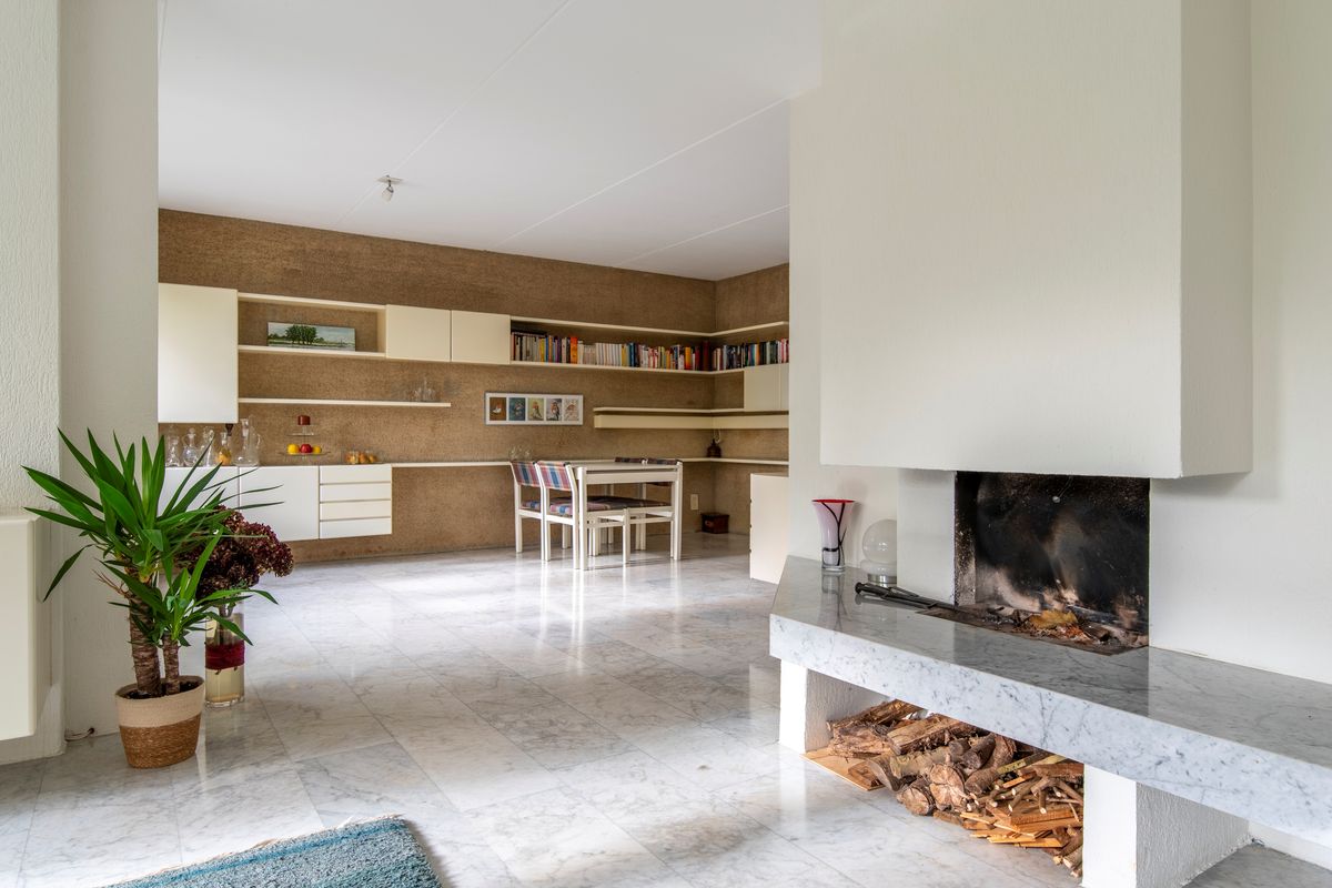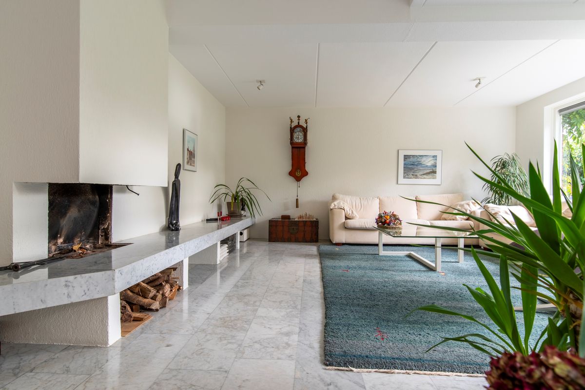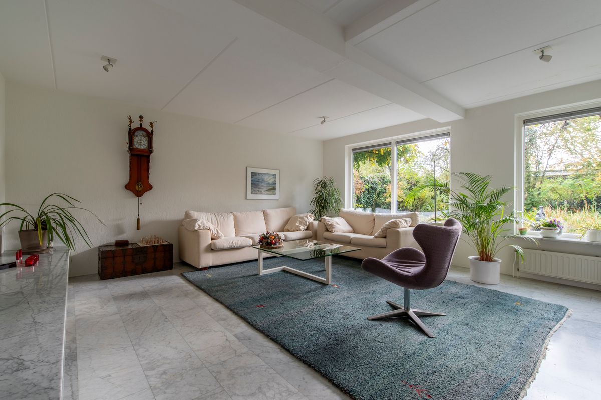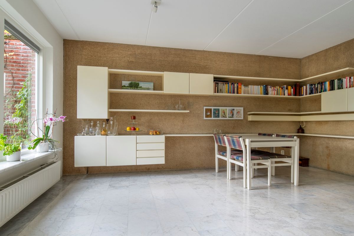 Begane grond: Via de extra brede oprit, met parkeergelegenheid voor meerdere auto's bereiken we de hal. Als eerste lopen we door naar de woonkamer. Deze fijne woonkamer heeft een schitterend zicht op de tuin. De naastgelegen eetkamer heeft meer dan voldoende ruimte voor het plaatsen van een eetkamertafel voor minimaal acht personen. Kortom, voldoende ruimte om hier urenlang te tafelen. De open haard bevindt zich strategisch tussen de woon- en eetkamer. De dichte keuken ligt aan de voorkant van het huis. De hier aanwezige, hoekopgestelde keukeninrichting is voorzien van een inductie kookplaat, een afzuigkap, een koelkast, een magnetron, een oven en een vaatwasser. Ook aanwezig is een apothekerskast. De werkkamer, die naast de keuken ligt, vraagt er om bij de keuken te worden getrokken. Weer terug in de hal zijn er deuren naar de meterkast, het toilet met een fonteintje en de garage. Deze garage heeft dubbele deuren aan de voorkant en een loopdeur aan de achterkant.