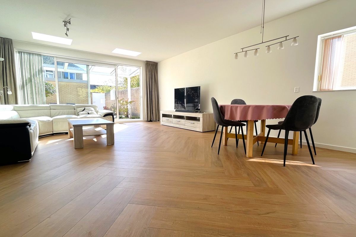 De lichte uitgebouwde woonkamer is voorzien van een mooie nieuwe pvc vloer. Veel licht door de glazen schuifpui, lichtkoepels, het zijraam en de ramen aan de voorzijde bij de open keuken.