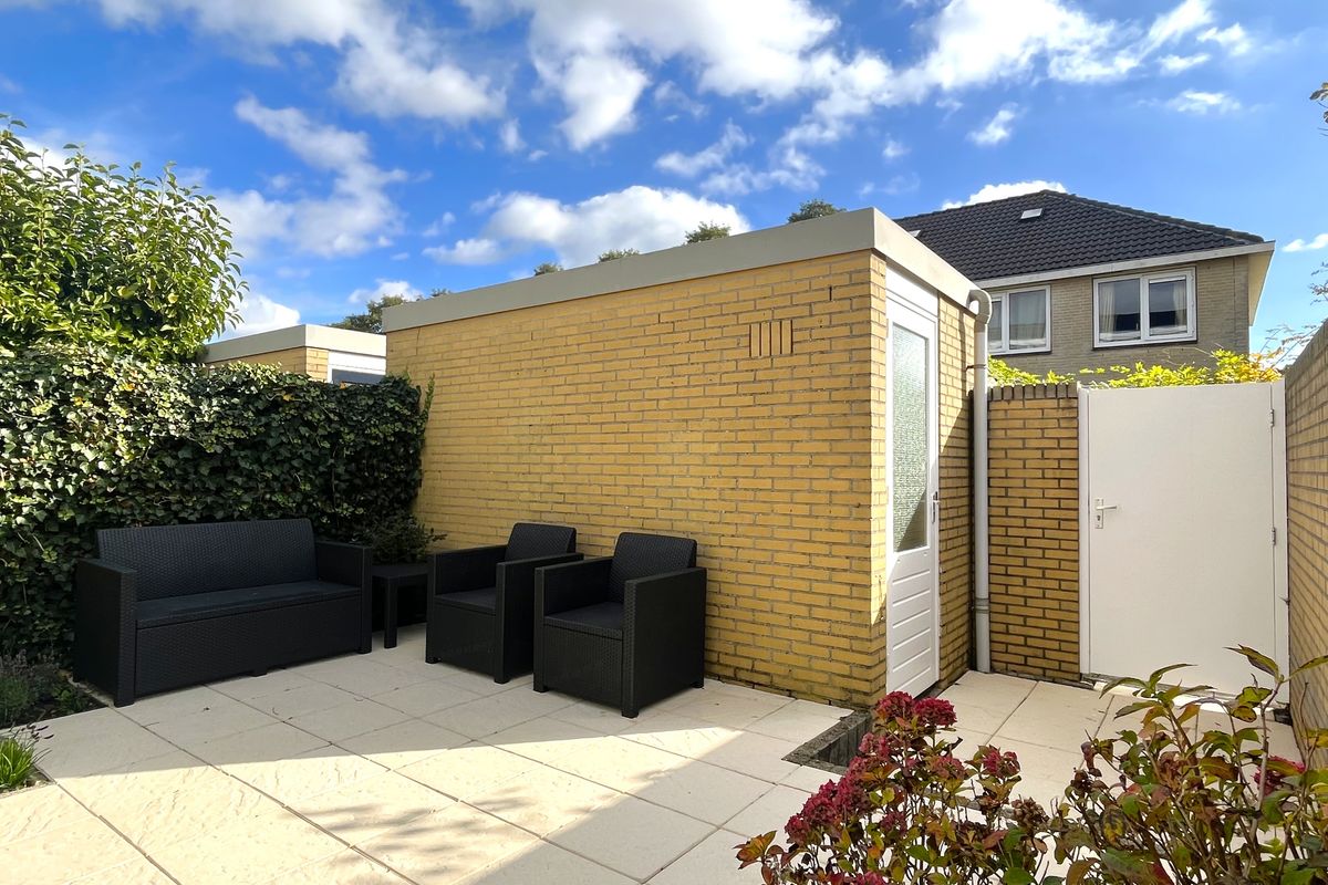 De schuifpui geeft toegang tot de heerlijke zonnige achtertuin (ca. 54 m²). Echt genieten. Deze tuin is lekker ruim, keurig betegeld en heeft een achterom. Deze beschikt ook over een mooi aangebouwde overkapping voor een beetje schaduw met op afstandbediening bestuurbare sunscreens. Verder een stenen schuur voor uw fietsen, etc.