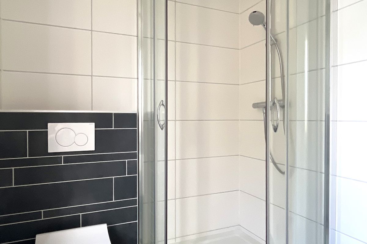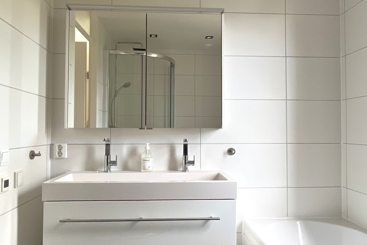 De nette badkamer is gelegen aan de voorzijde van de woning en is voorzien van een wastafel, inloopdouche, badopstelling, zwevend toilet, electrische vloerverwarming en is netjes betegeld.