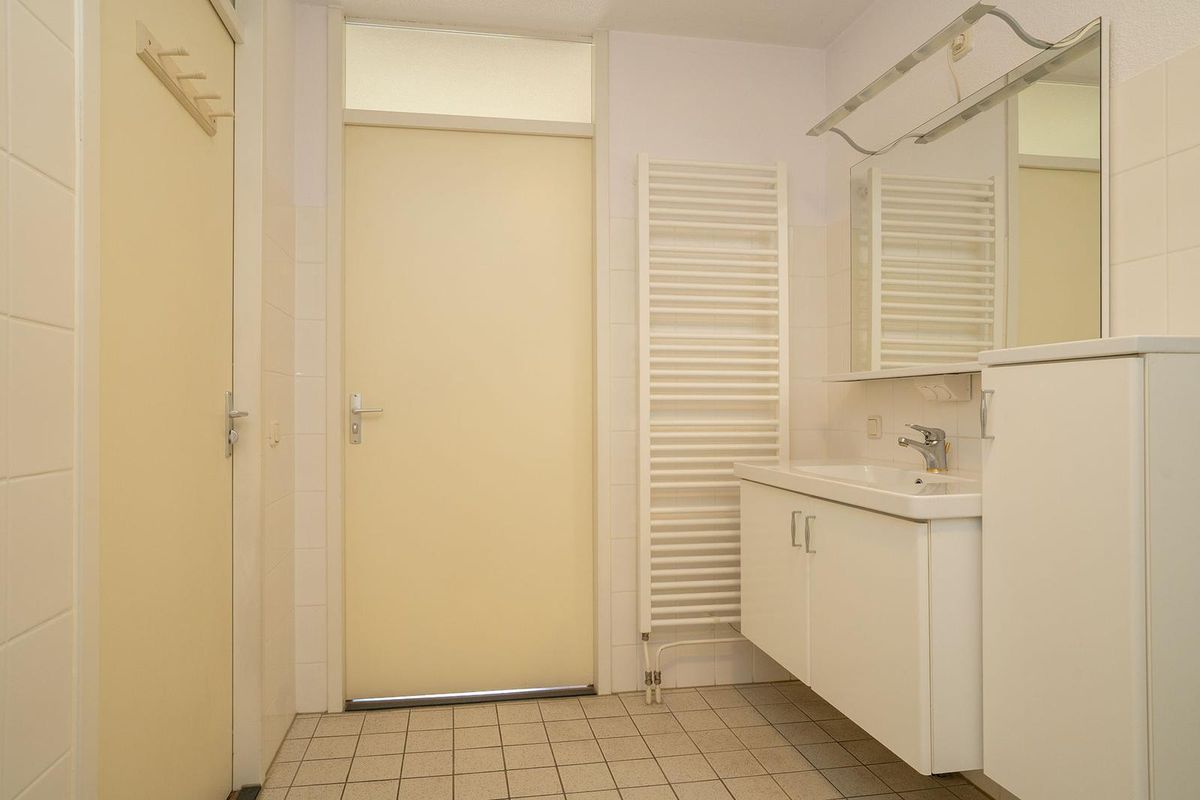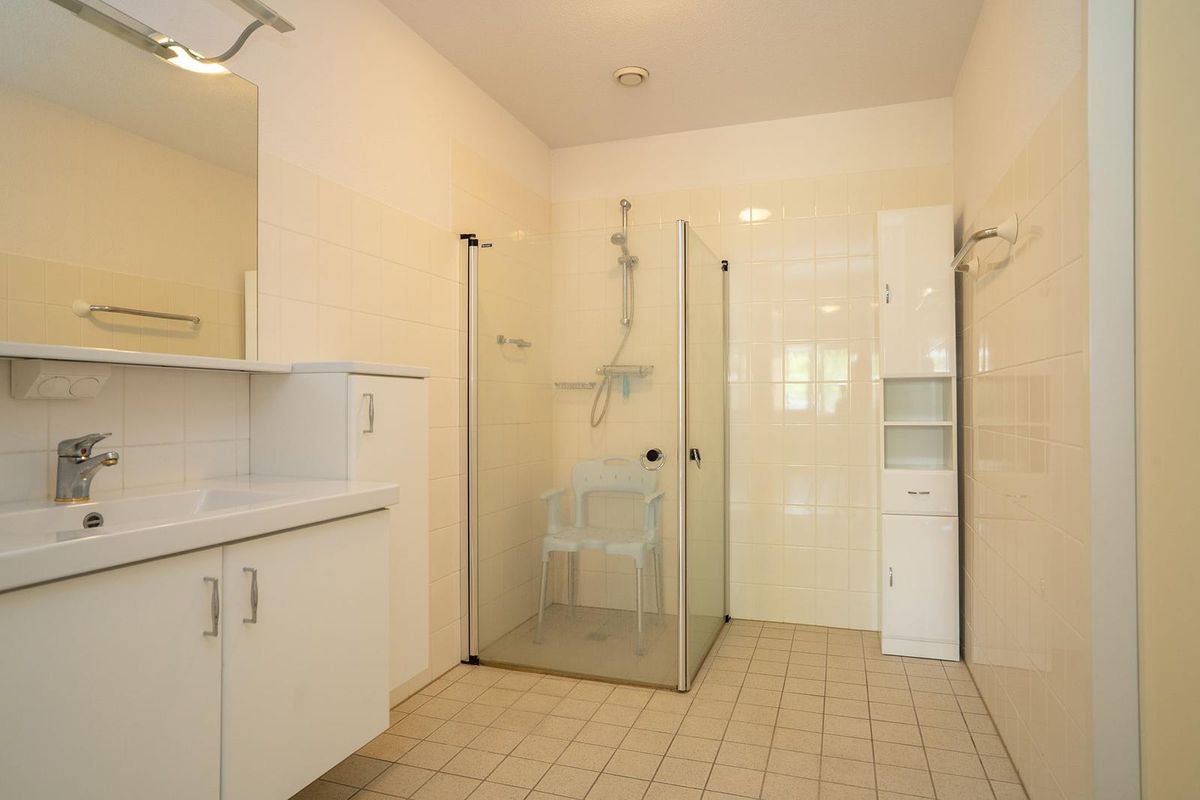 Deze ruime, geheel betegelde badkamer is daarnaast ook vanuit de hal toegankelijk en is ingericht met een douche, radiator en een wastafel met spiegel en bergkast.