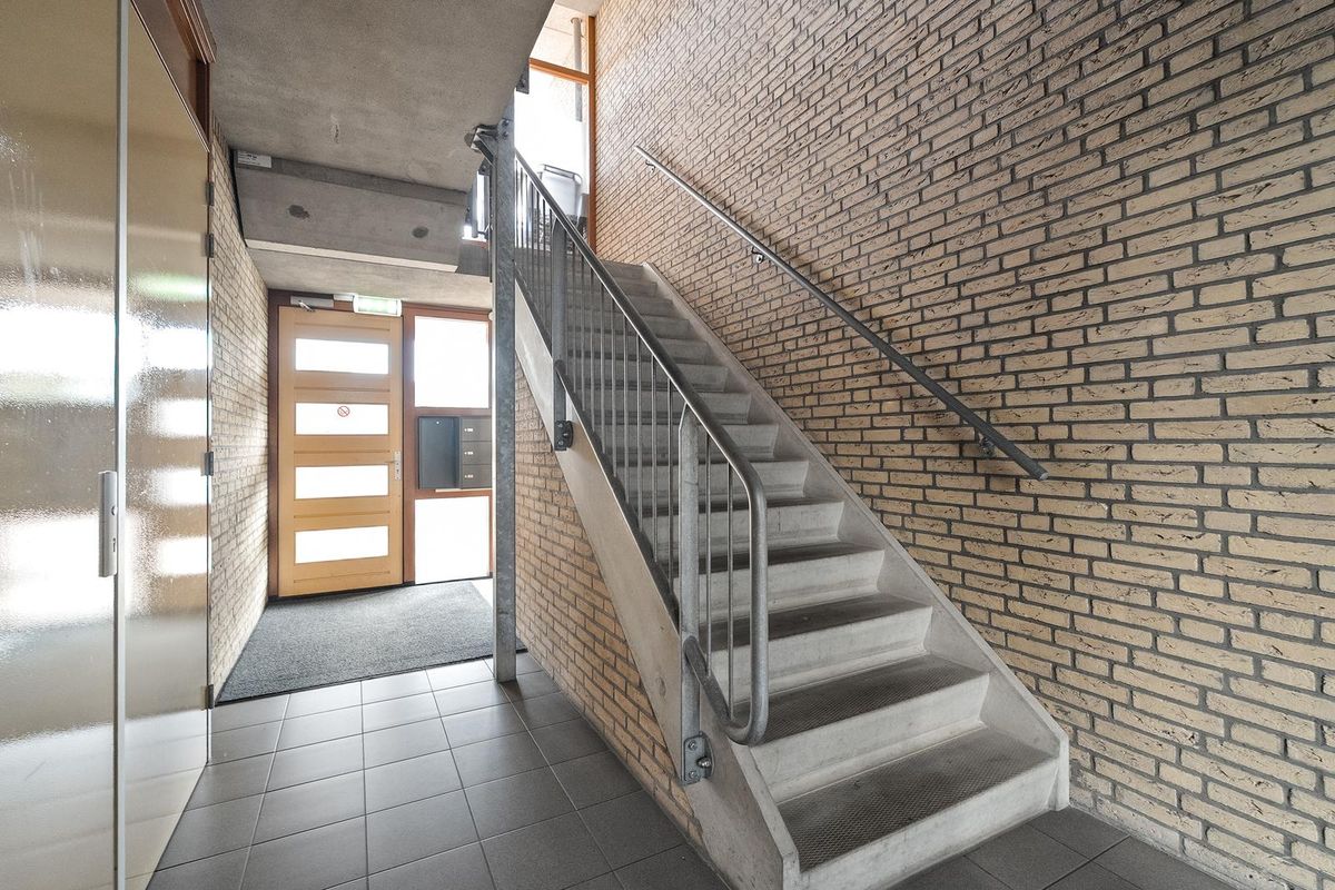 Hoofdentree appartementencomplex met toegang tot een trappenhuis, de lift, de garage en gemeenschappelijke binnentuin/plaats.