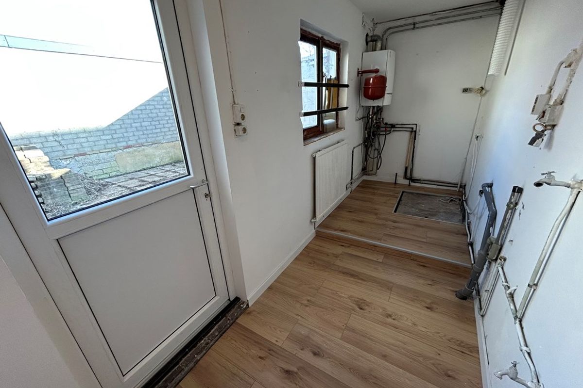 Bijkeuken 4,70 x 1,55 met laminaatvloer, deur naar achtertuin, aansluitingen was-apparatuur, cv-combiketel Remeha Calenta (eigendom) en luik naar kruipruimte.