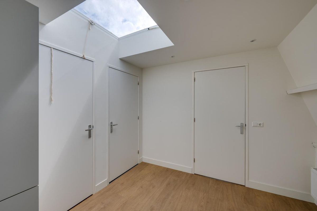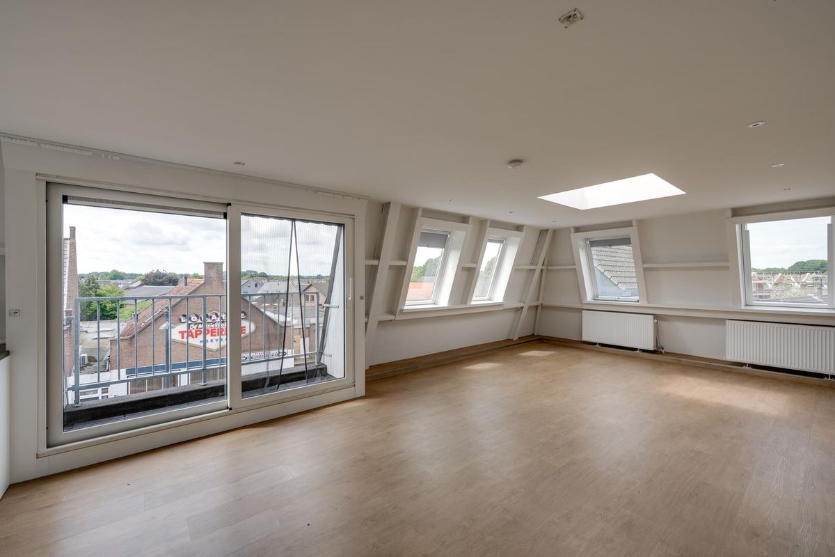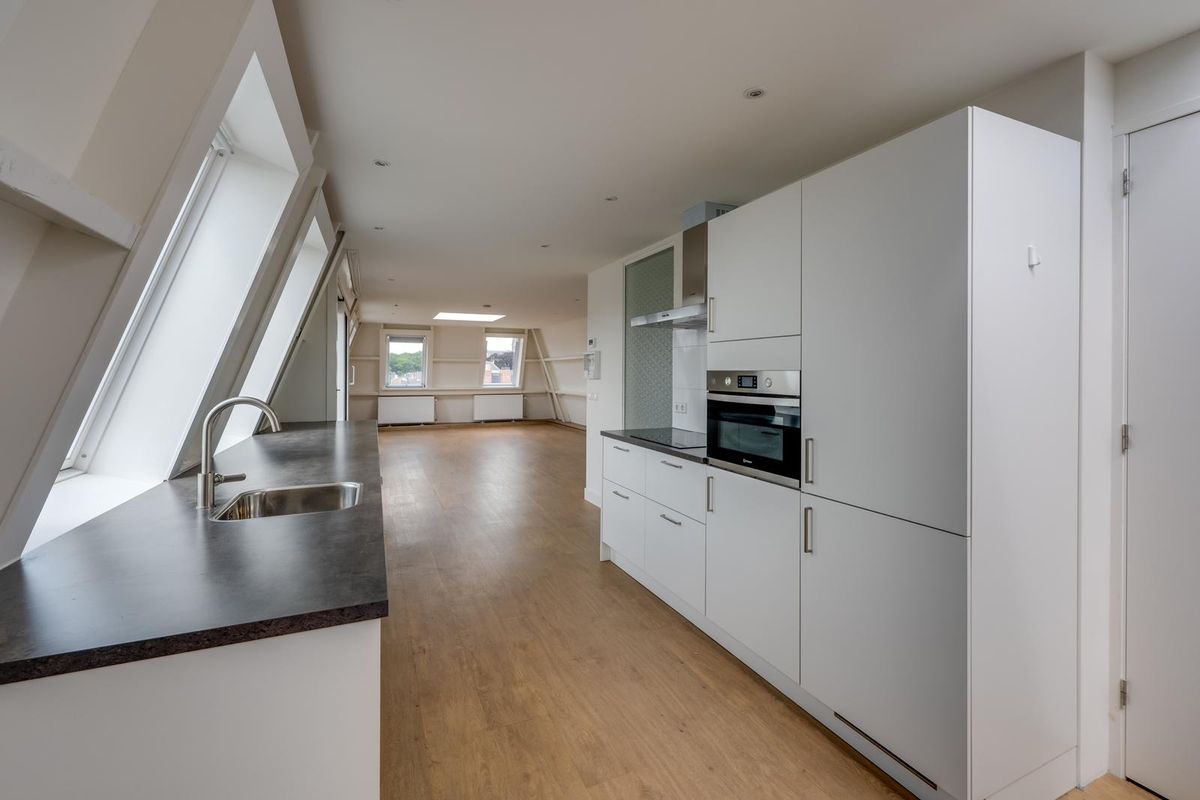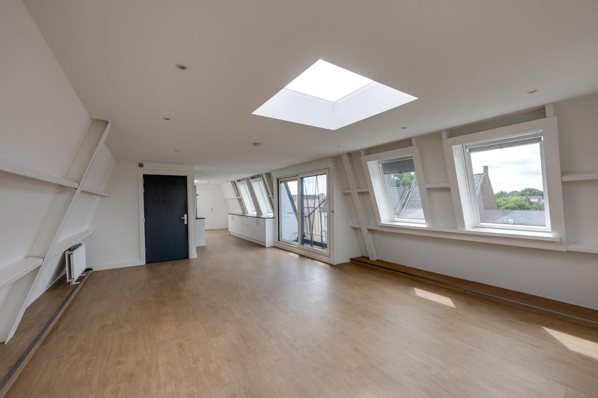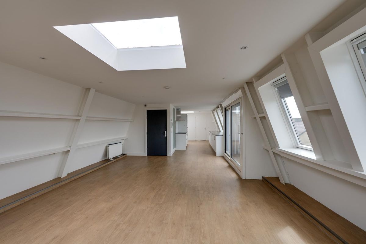 Via de entree stap je het appartement op de tweede verdieping binnen. De ruime en lichte woonkamer is een echte eyecatcher: dankzij de vele raampartijen en de lichtkoepels geniet je hier de hele dag door van een prachtige lichtinval. De strakke PVC vloer en ingebouwde spotjes in het plafond zorgen voor een moderne uitstraling. Vanuit de woonkamer heb je toegang tot het eerste balkon – een heerlijk plekje om buiten te zitten.