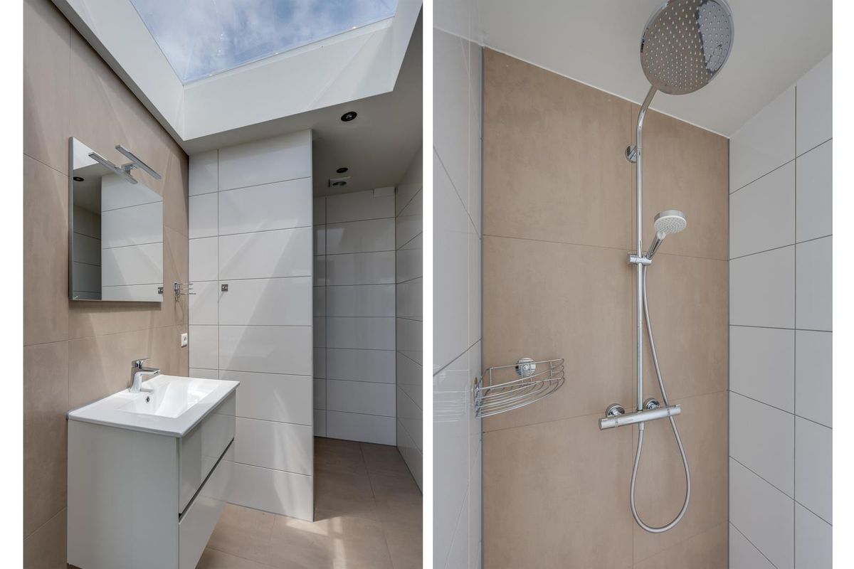 Vanuit de keuken bereik je de volledig betegelde badkamer. Deze is uitgerust met een ruime inloopdouche, modern wastafelmeubel, mechanische ventilatie én een lichtkoepel waardoor ook hier volop daglicht binnenkomt.