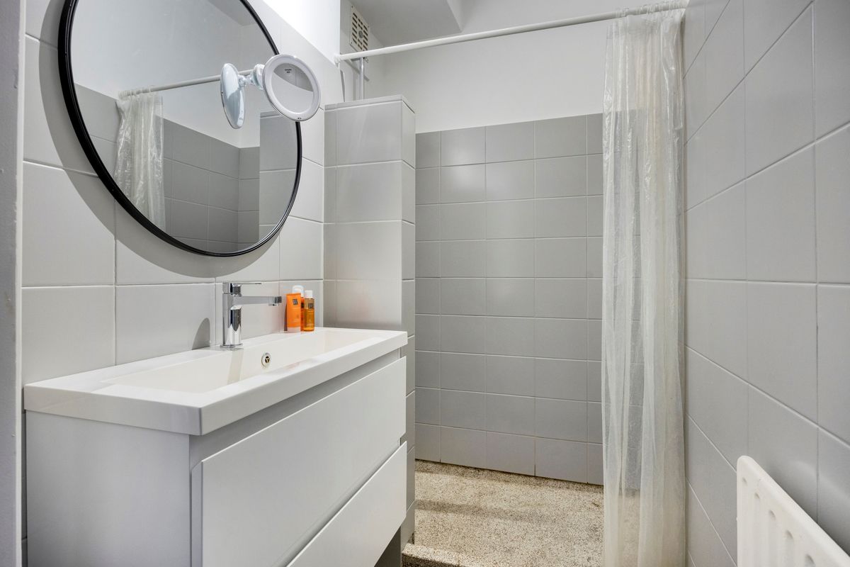 De badkamer is uitgerust met een inloopdouche, wastafel met meubel, spiegel en radiator.