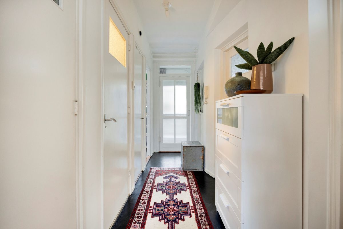 Afgesloten entree met bellen- en brievenbustableau. Via het verzorgde trappenhuis met originele details, of met de lift, bereikt u de eerste verdieping.