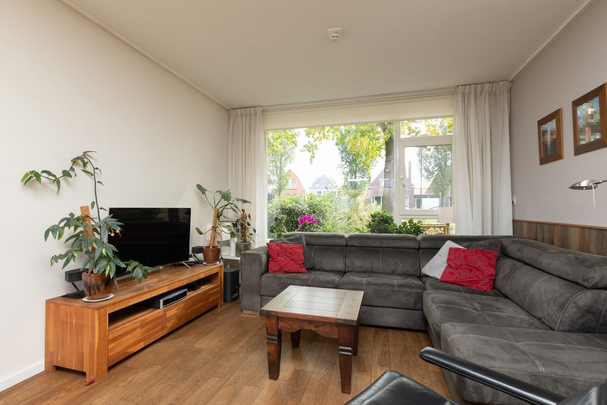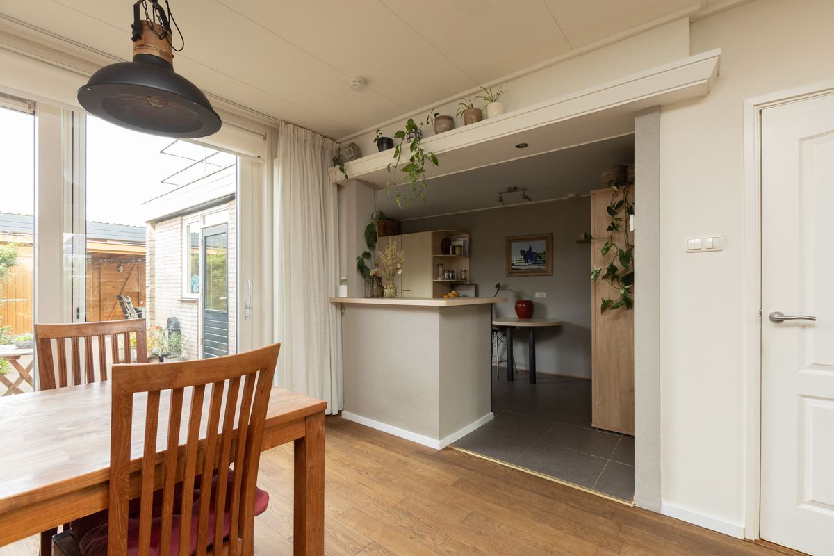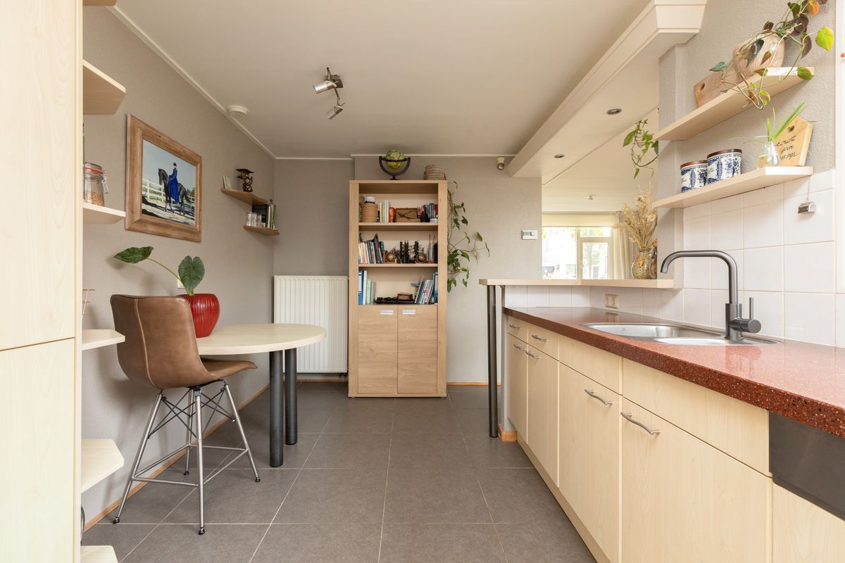 Entree, hal, meterkast, toilet, trapopgang en trapkast. De doorzonkamer is uitgevoerd in lichte kleurstellingen en heeft veel lichtinval door de raampartij aan de voorzijde en de grote schuifpui aan de achterzijde. De halfopen keuken is voorzien van inbouwapparatuur en een stenen werkblad. Vanuit de keuken is er een toegangsdeur naar de aangebouwde bijkeuken met kastenwand. Hier bevinden zich de witgoedaansluitingen en de cv-opstelling. Middels de achterdeur in de bijkeuken heeft u toegang tot de achtertuin. De onderhoudsvriendelijke achtertuin heeft een houten bergschuur met een overkapping en een achterom via de achter gelegen steeg.