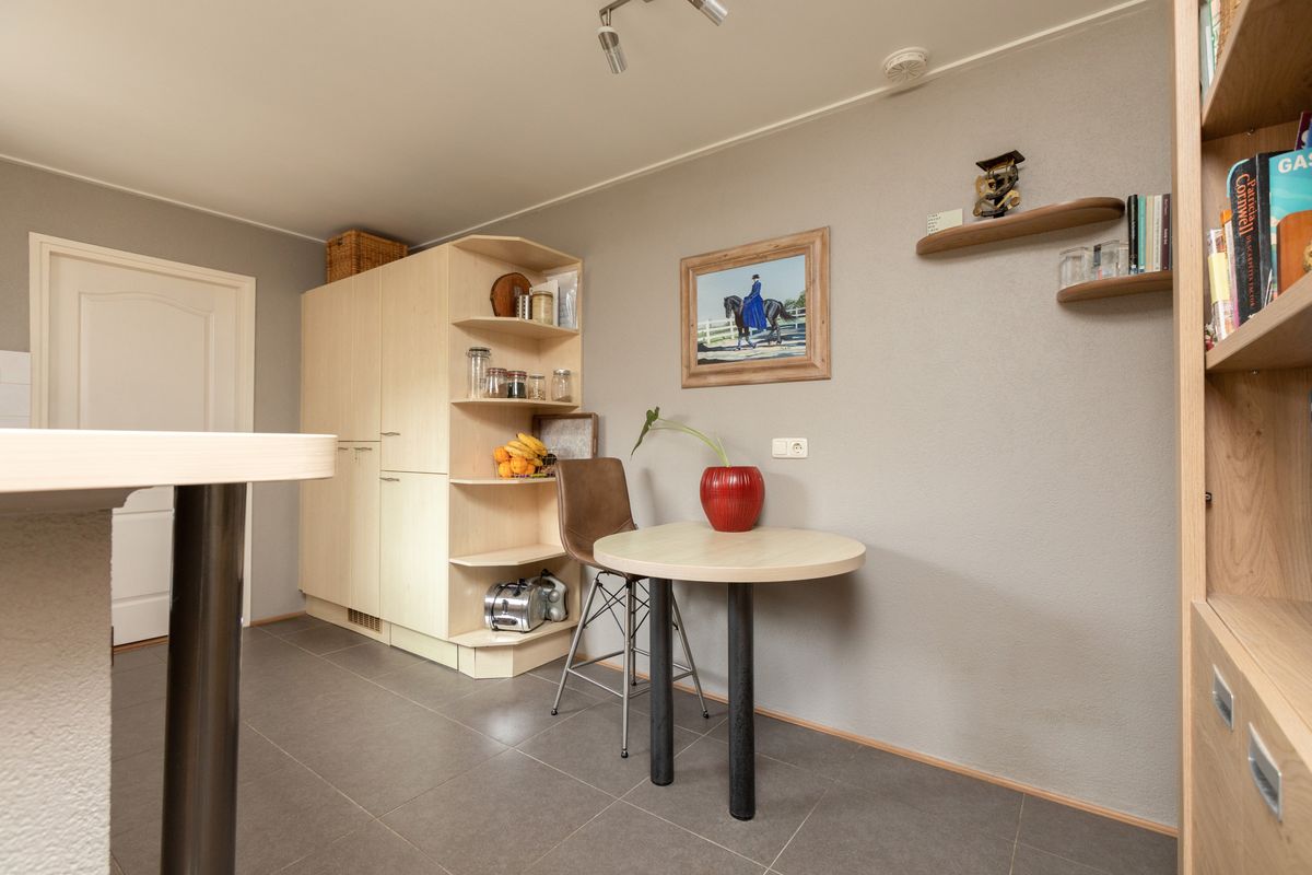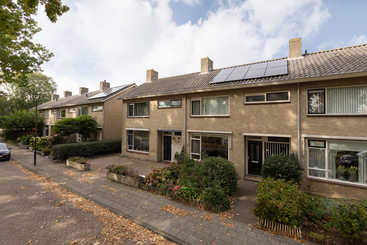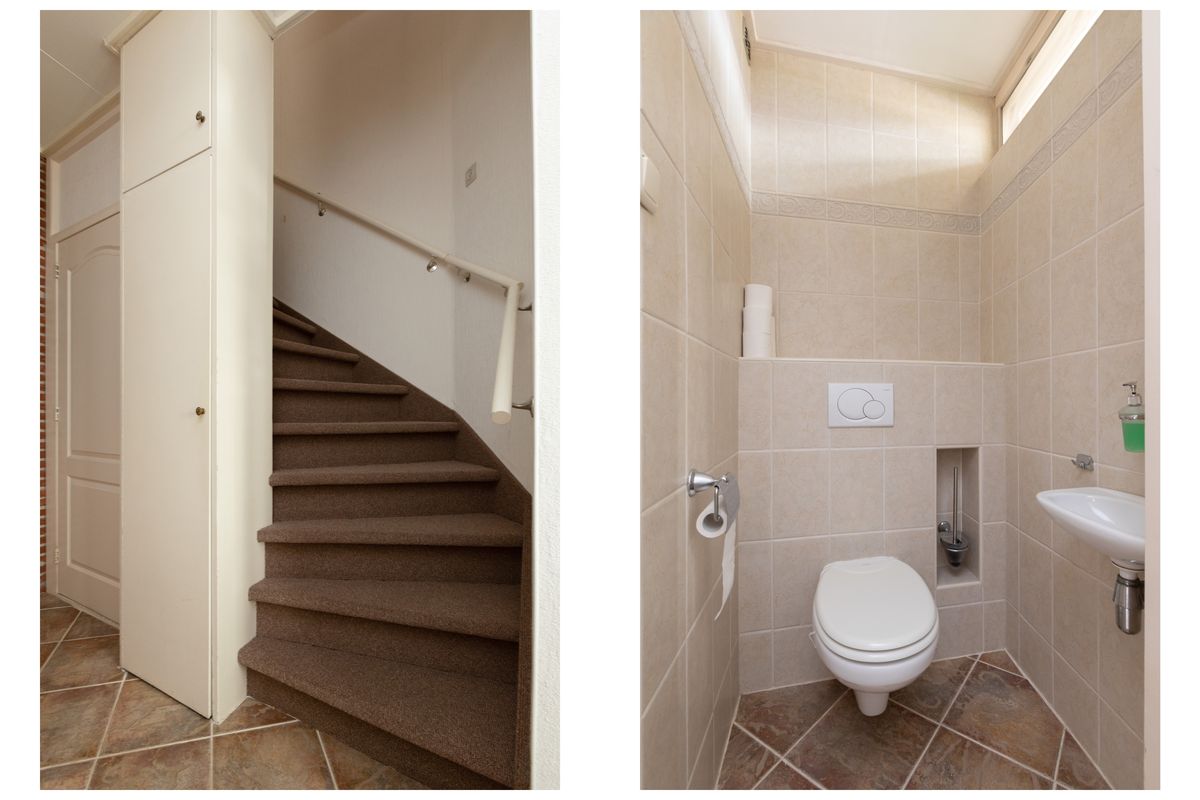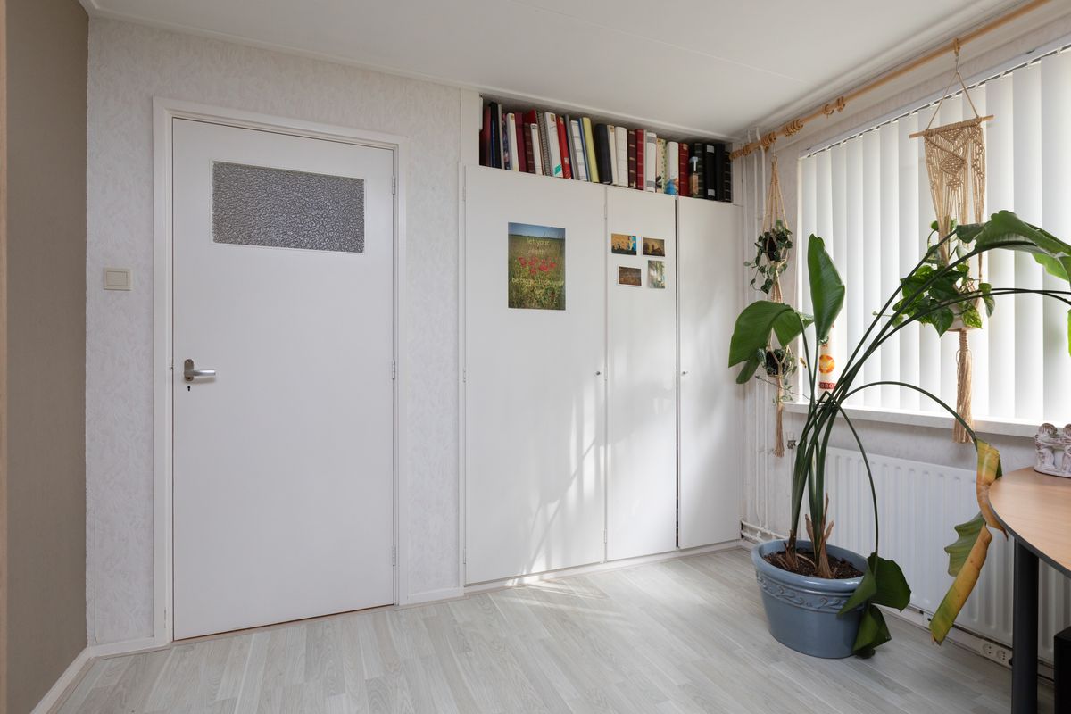 Entree, hal, meterkast, toilet, trapopgang en trapkast. De doorzonkamer is uitgevoerd in lichte kleurstellingen en heeft veel lichtinval door de raampartij aan de voorzijde en de grote schuifpui aan de achterzijde. De halfopen keuken is voorzien van inbouwapparatuur en een stenen werkblad. Vanuit de keuken is er een toegangsdeur naar de aangebouwde bijkeuken met kastenwand. Hier bevinden zich de witgoedaansluitingen en de cv-opstelling. Middels de achterdeur in de bijkeuken heeft u toegang tot de achtertuin. De onderhoudsvriendelijke achtertuin heeft een houten bergschuur met een overkapping en een achterom via de achter gelegen steeg.