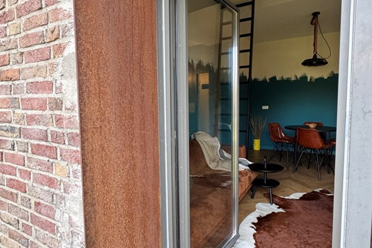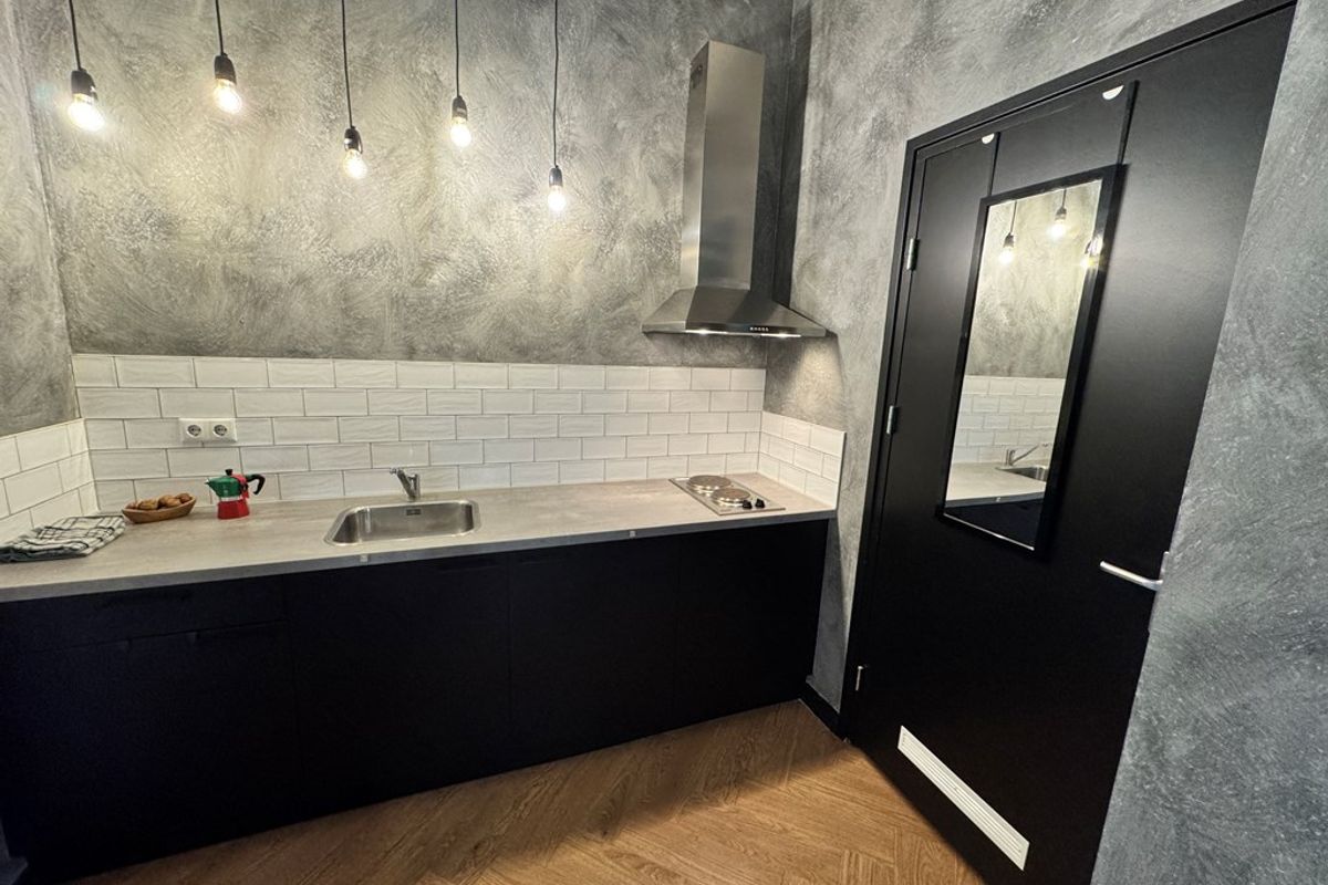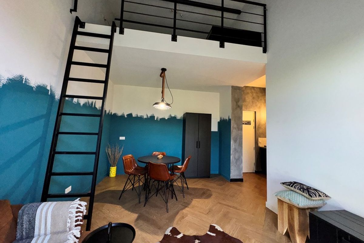 Entree naar de studio met direct toegang tot het lichte woongedeelte. De open keuken is compact en functioneel. De luxe badkamer is modern afgewerkt en voorzien van regendouche, hangtoilet en wastafel. Via een vaste laddertrap bereik je de slaapvide, waardoor je het leefgedeelte maximaal benut.