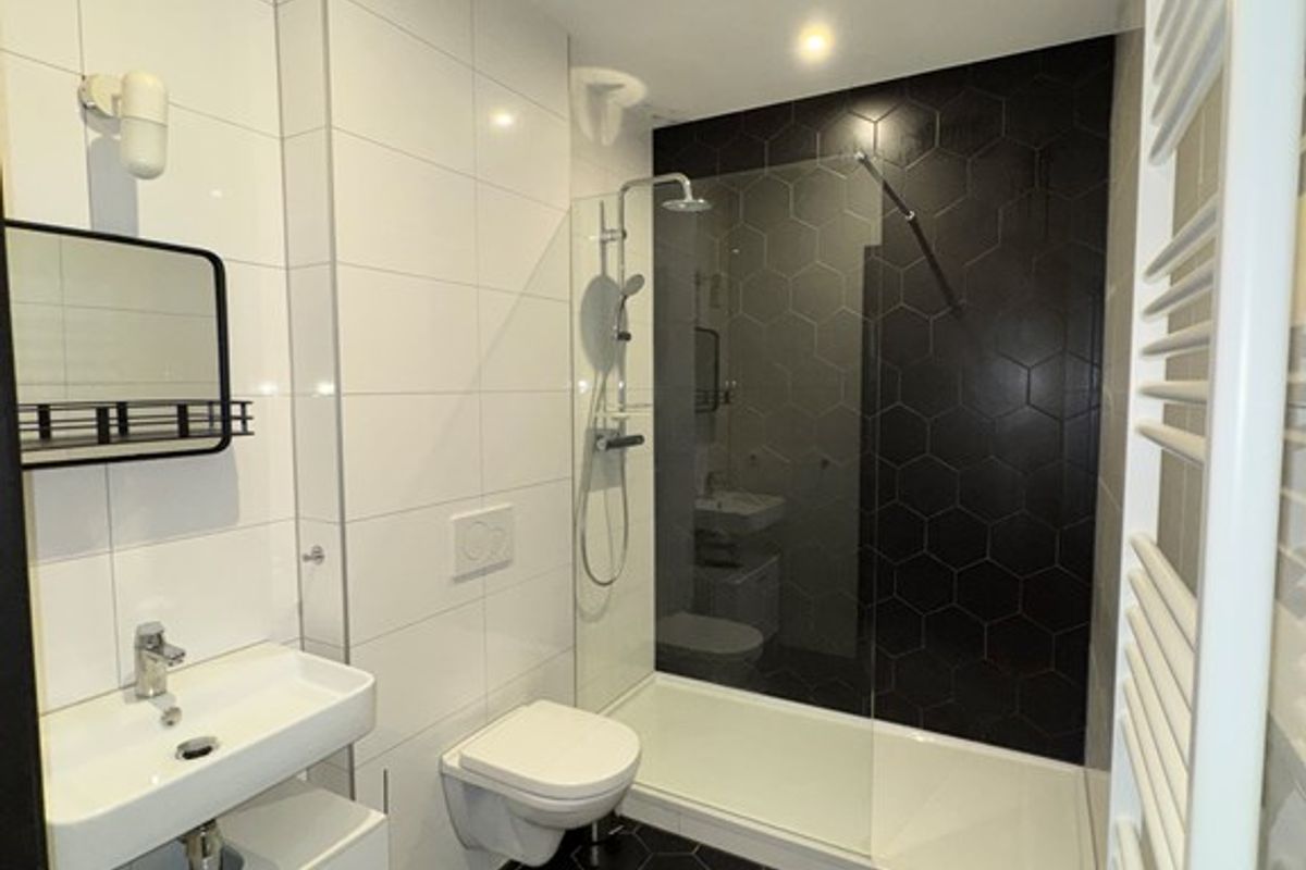 Compacte eigen keuken en luxe badkamer met regendouche, hangtoilet en wastafel