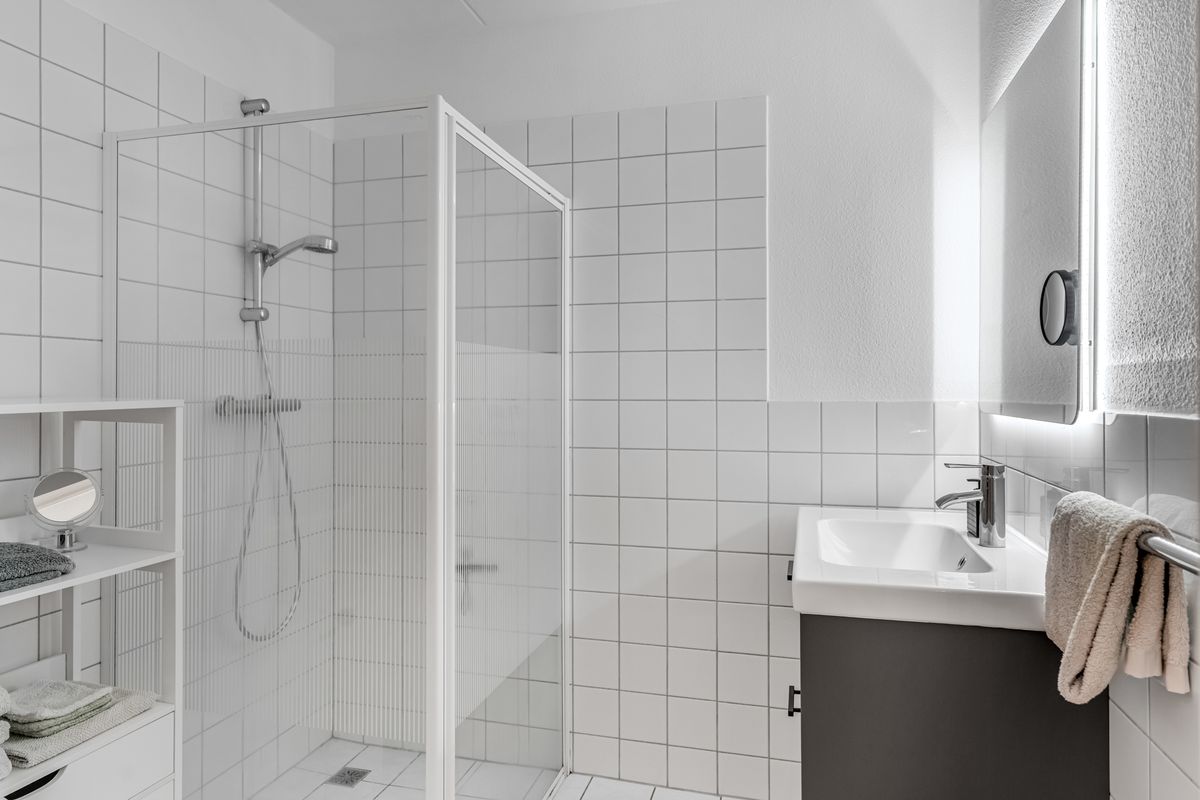 De badkamer is voorzien van neutrale vloer- en wandtegels, een douche en een modern wastafelmeubel met wandspiegel. Het toilet bevindt zich separaat van de badkamer, verderop in de hal.
