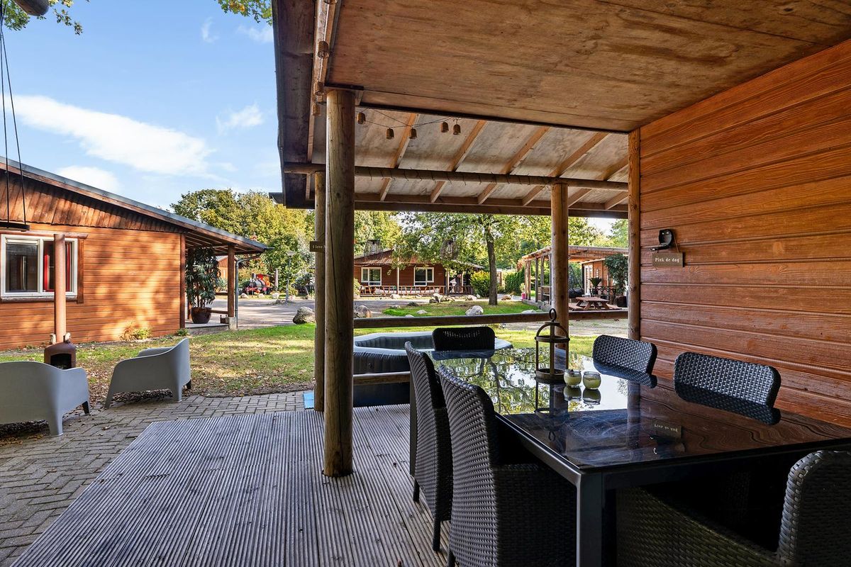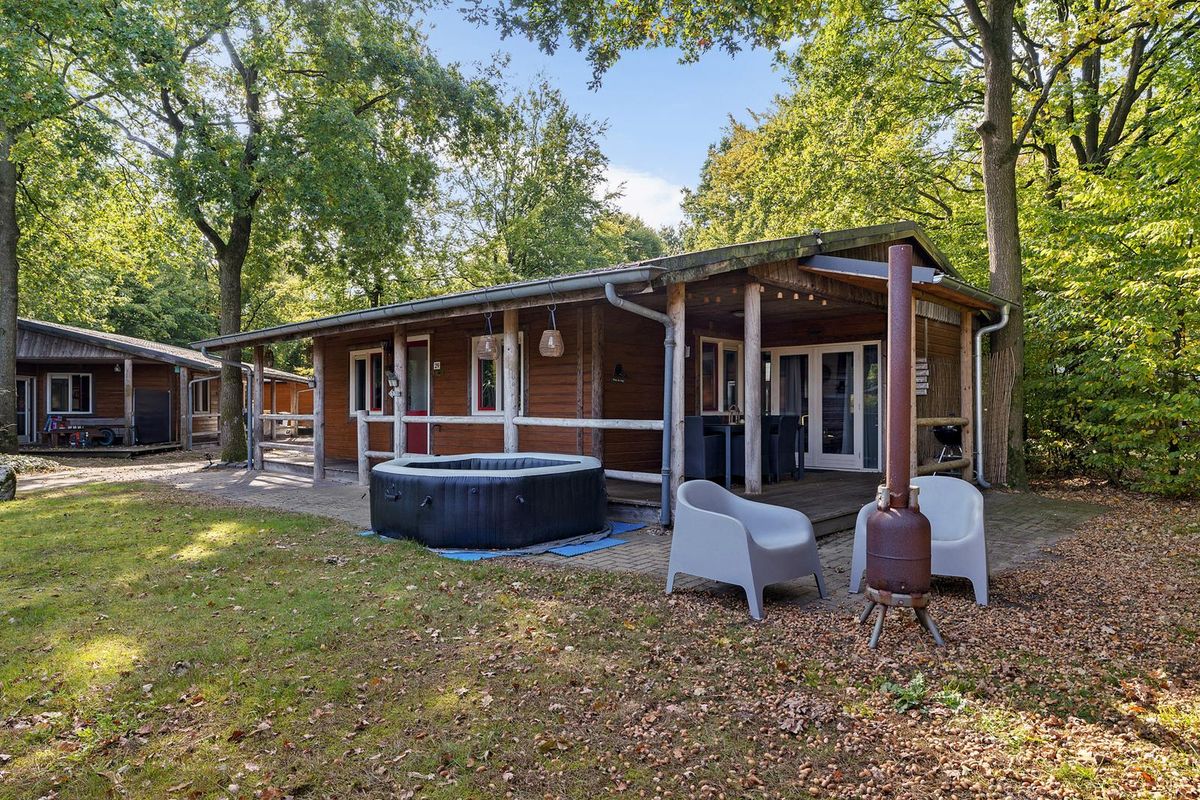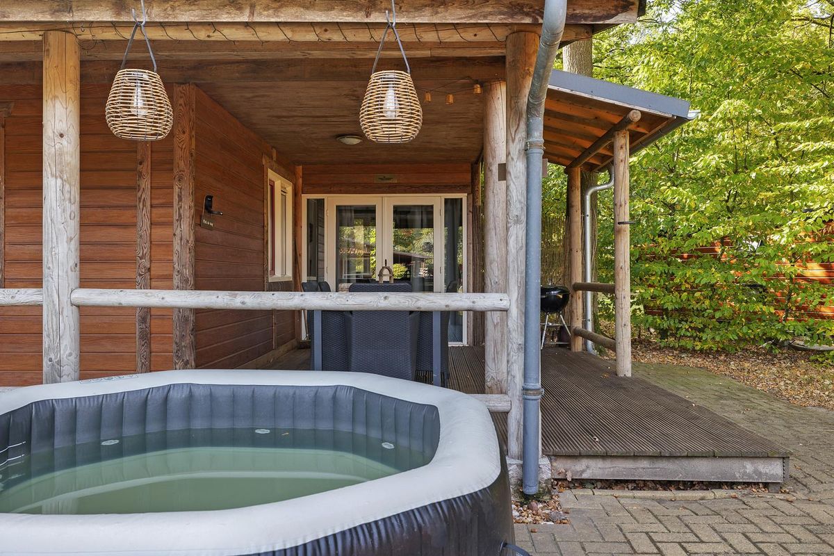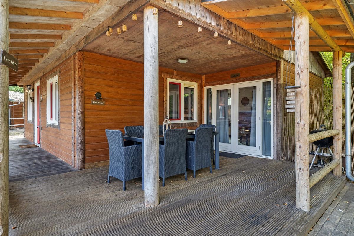 Wat meteen opvalt, is de royale veranda die aan de voor- en rechterzijde van de chalet is gebouwd. Met een oppervlakte van ongeveer 29 m² en volledig overkapt, kun je hier het hele jaar buiten zitten, ongeacht het weer. De aanwezige jacuzzi maakt het ontspannen buitenleven compleet en zorgt voor dat echte vakantiegevoel.