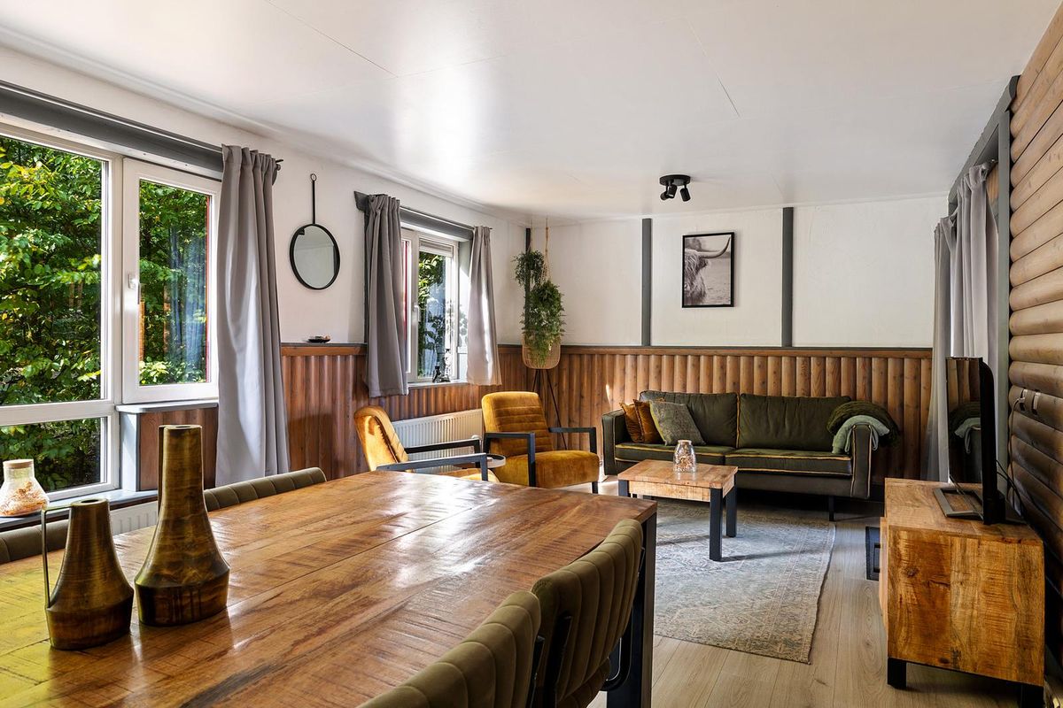 • Vanuit de woonkamer heb je uitzicht op de veranda uitgevoerd in Siberisch Larikshout en op de omgeving.