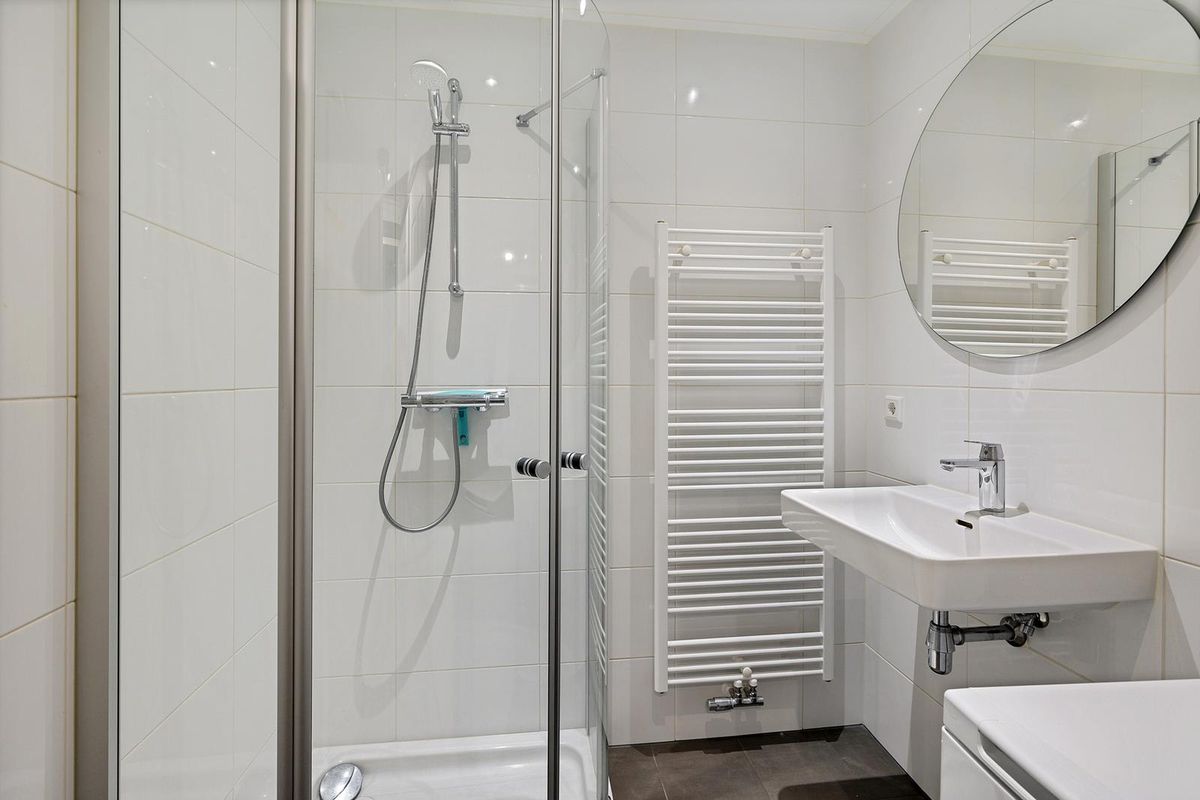 Binnen kom je via de voordeur in een ruime hal die toegang geeft tot de woonkamer, de drie slaapkamers, het toilet en de badkamer. De woonkamer is licht en ruim, met een oppervlakte van ongeveer 22 m² en een vrij uitzicht op de veranda en de groene omgeving. Aangrenzend vind je de halfopen keuken, compact maar compleet, met een hoekopstelling waarin alles aanwezig is om comfortabel te koken.
