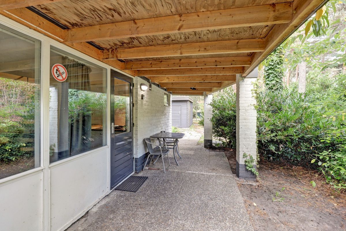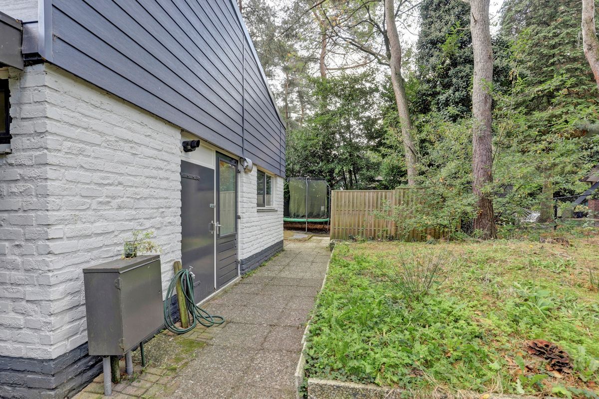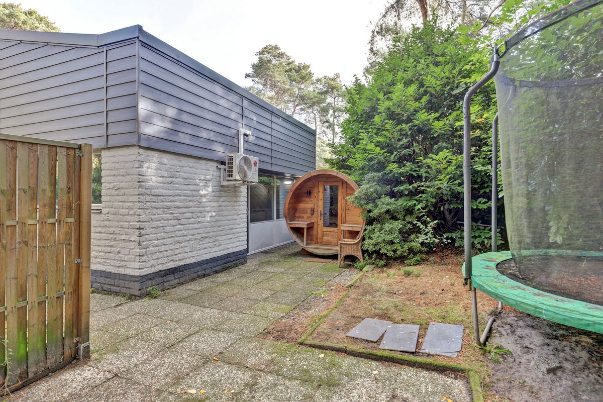 De tuin omringt het huis met volop ruimte om te tuinieren, te lezen of gewoon te genieten van de stilte. Onder het overdekte terras bij de ingang zit je beschut, zelfs als het zachtjes regent, het geluid van de druppels op het dak maakt het alleen maar gezelliger. En achter de woning wacht de ultieme verwennerij: een eigen sauna. De warmte, het hout, de geur van het bos, alles komt hier samen in pure ontspanning. Aan de achterkant van de woning beschik je over twee eigen parkeerplaatsen en een houten tuinhuis biedt ruimte voor fietsen, tuingereedschap of voor het opbergen van tuinmeubels. Met behulp van een buitenkraan hou je de tuin mooi groen.