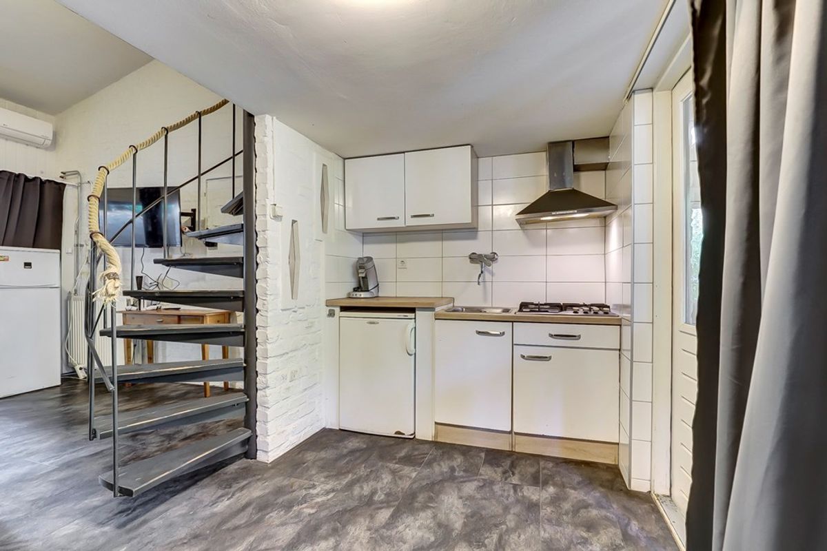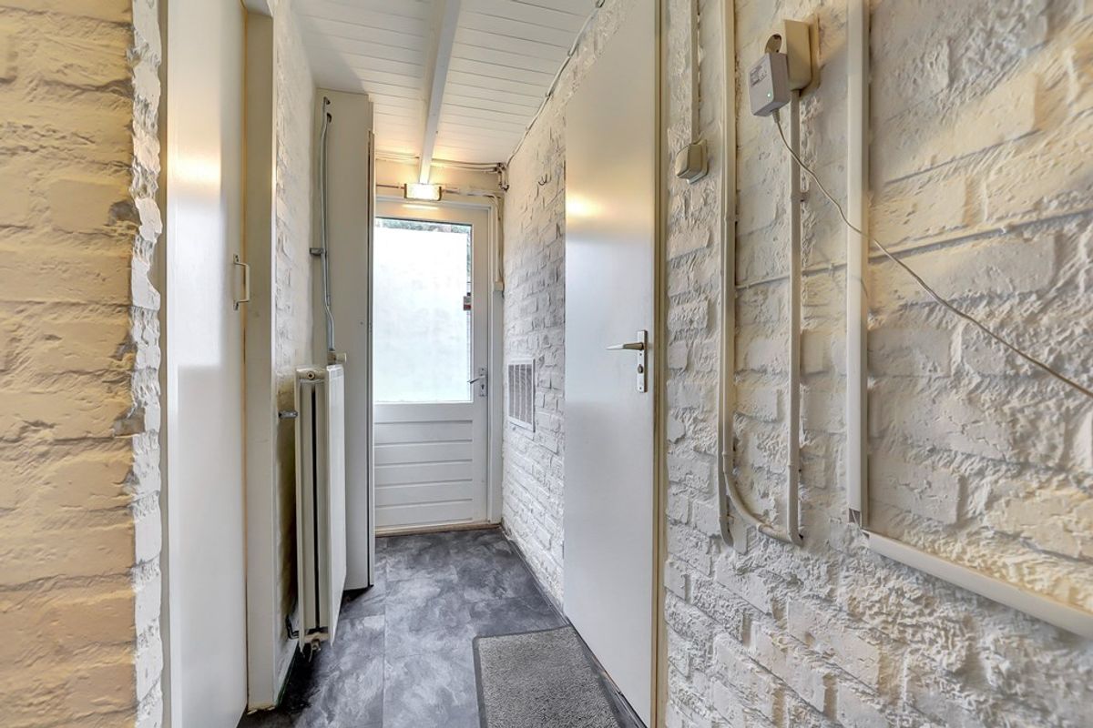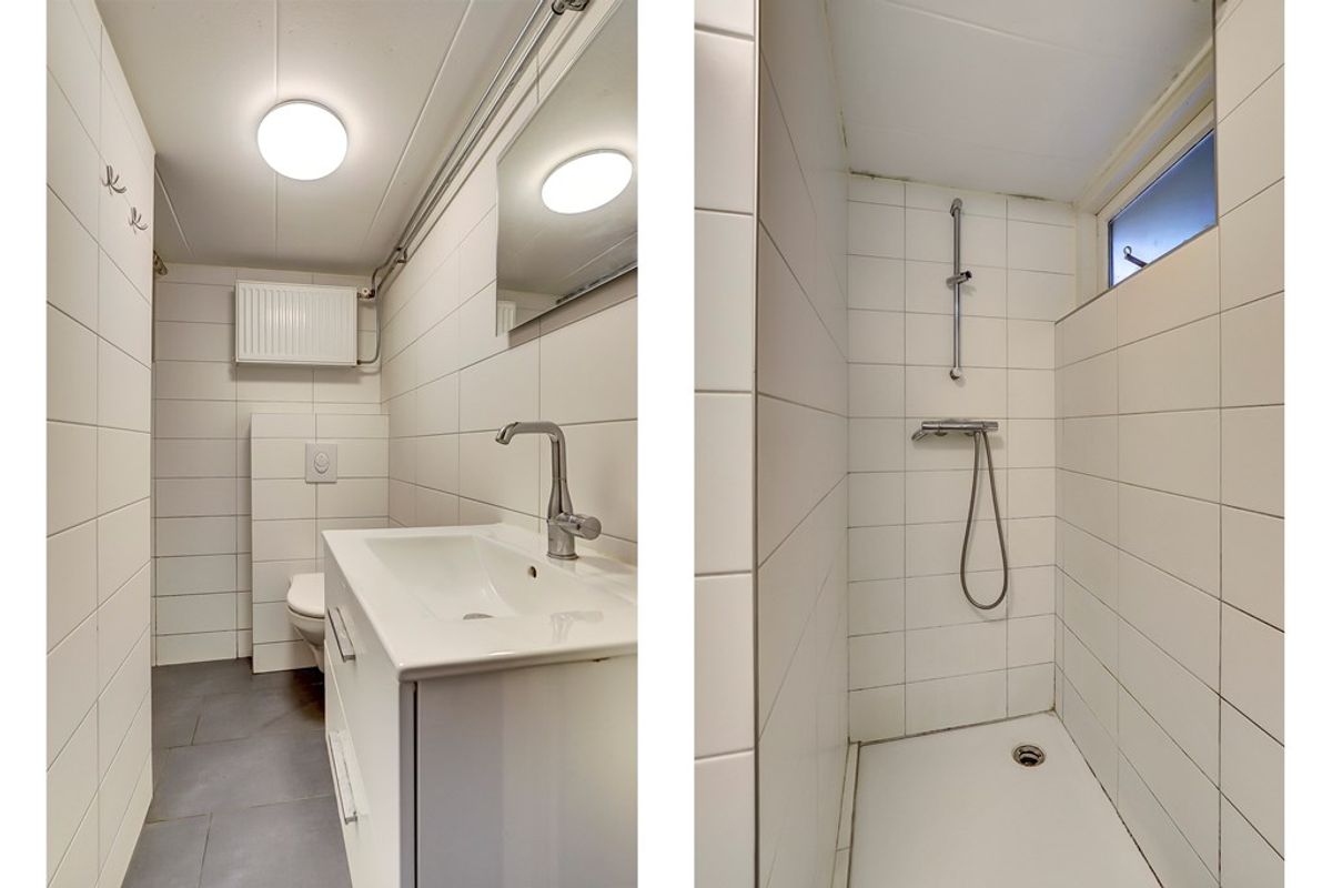 Recht tegenover de slaapkamer ligt de badkamer die is uitgerust met een inloopdouche, een wastafel en een toilet. De lichte betegeling geeft de ruimte een frisse, neutrale uitstraling en maakt het geheel onderhoudsvriendelijk.