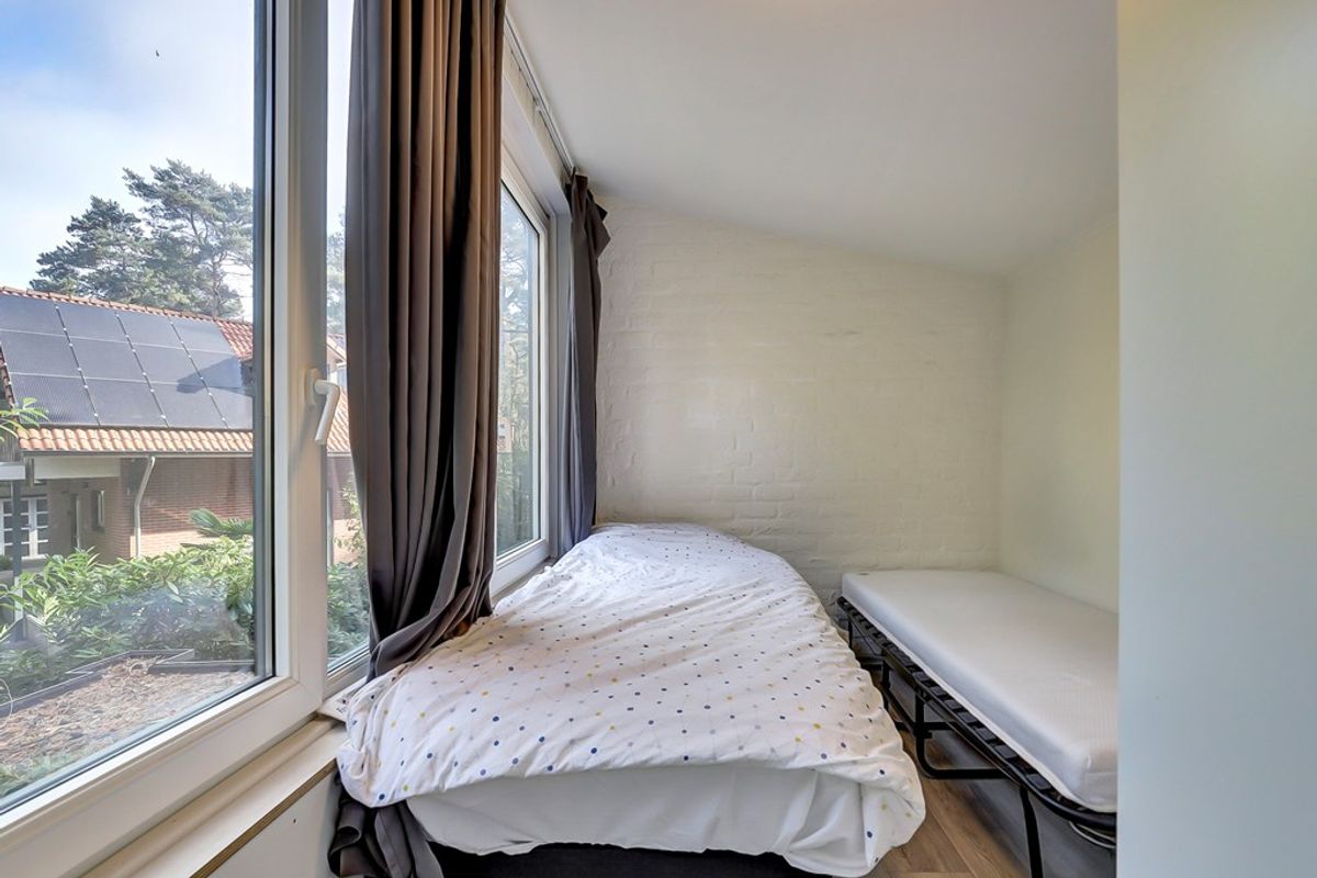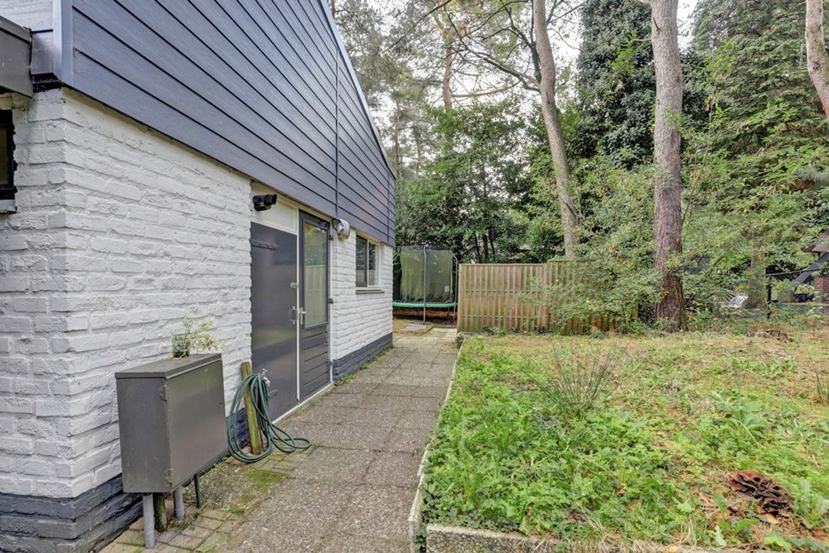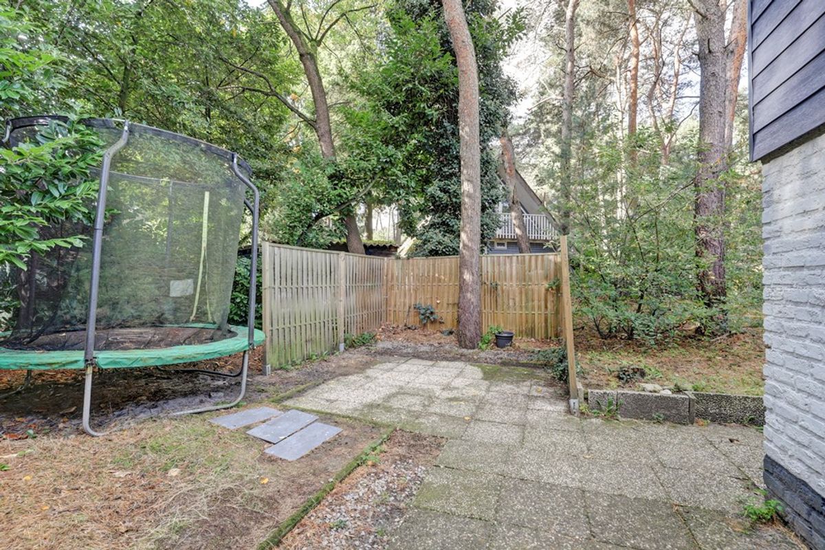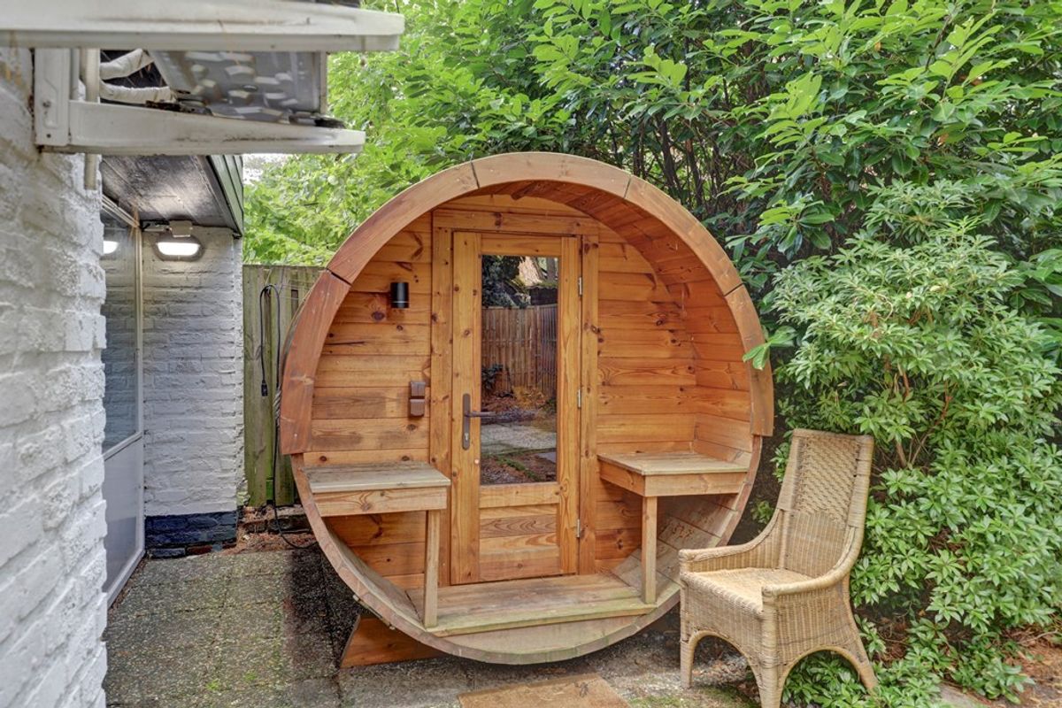 De tuin omringt het huis met volop ruimte om te tuinieren, te lezen of gewoon te genieten van de stilte. Onder het overdekte terras bij de ingang zit je beschut, zelfs als het zachtjes regent, het geluid van de druppels op het dak maakt het alleen maar gezelliger. En achter de woning wacht de ultieme verwennerij: een eigen sauna. De warmte, het hout, de geur van het bos, alles komt hier samen in pure ontspanning. Aan de achterkant van de woning beschik je over twee eigen parkeerplaatsen en een houten tuinhuis biedt ruimte voor fietsen, tuingereedschap of voor het opbergen van tuinmeubels. Met behulp van een buitenkraan hou je de tuin mooi groen.