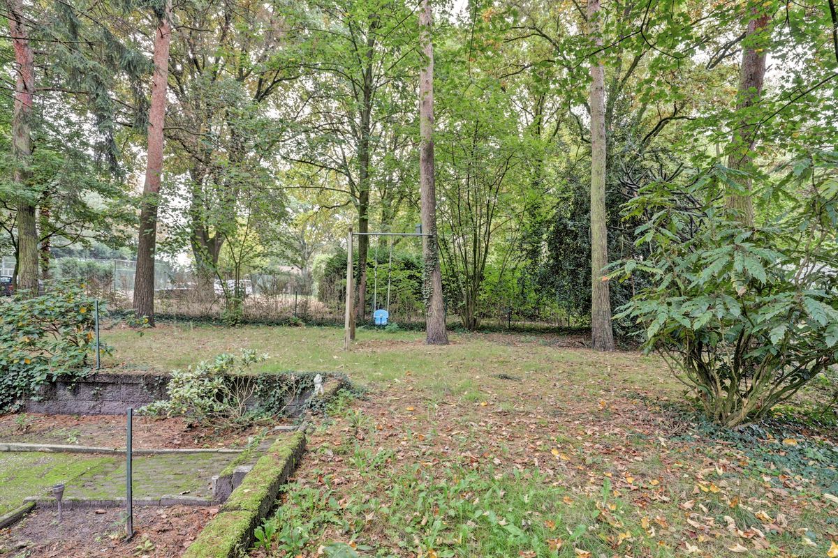 De tuin ligt rondom de woning en heeft twee afsluitbare toegangspoortjes. De tuin is zo natuurlijk mogelijk gehouden en bestaat voornamelijk uit bosgrond met enkele hoge bomen en diverse begroeiing. Aan de kant van de woonkamer is een overdekt terras aanwezig. Aan de linkerkant langs de woning ligt een houten tuinhuisje.