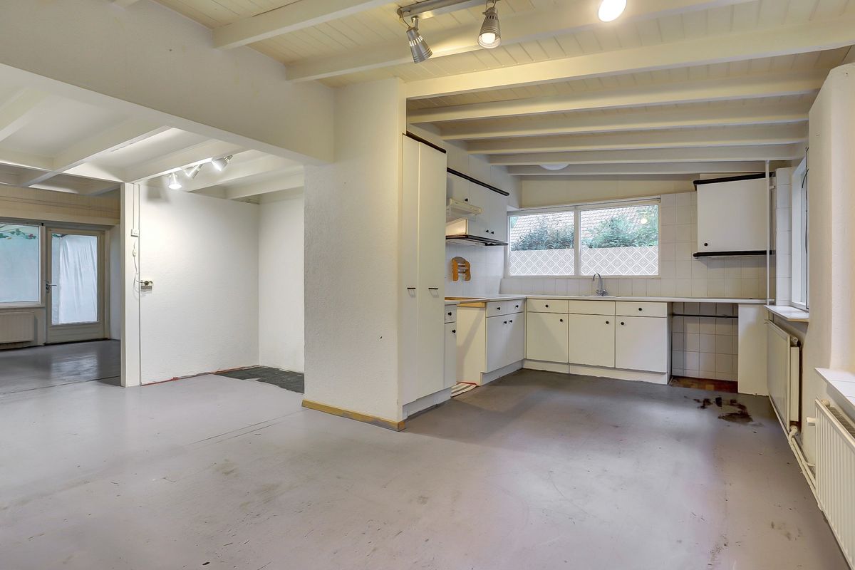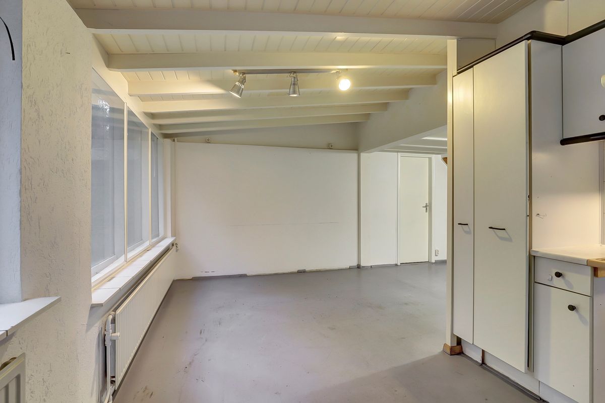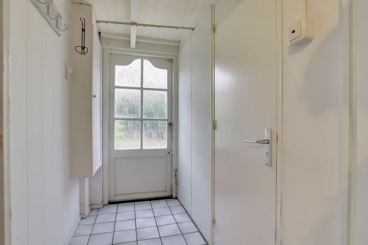 De begane grond bestaat uit een ruime woonkamer met open keuken die enigszins van elkaar gescheiden zijn door de entree in het midden van de woning. De zijkanten zijn volledig voorzien van ramen waardoor er lekker veel licht naar binnen komt en via de woonkamer heb je toegang tot het overdekt terras in de tuin. Het balkenplafond zorgt voor een knusse ‘cottage’sfeer.