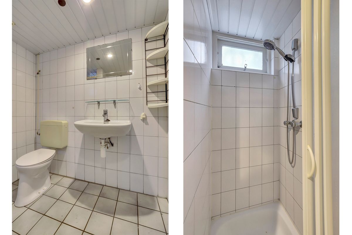 De badkamer bevindt zich aan de linkerkant in de entree. Met een douche, toilet en wastafel is de badkamer eenvoudig maar functioneel ingericht.