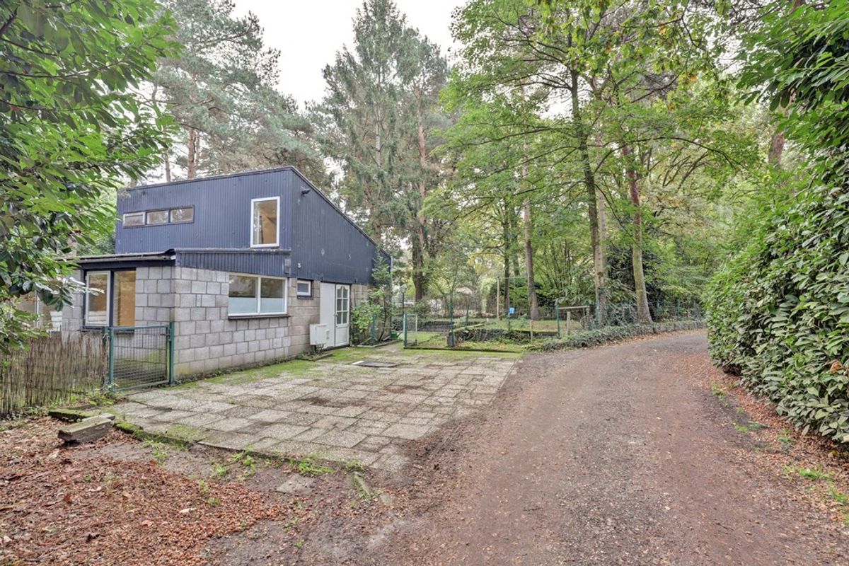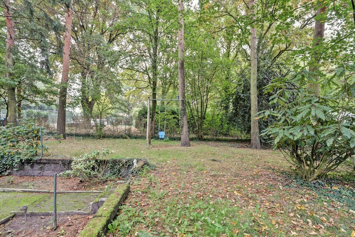 De tuin ligt rondom de woning en heeft twee afsluitbare toegangspoortjes. De tuin is zo natuurlijk mogelijk gehouden en bestaat voornamelijk uit bosgrond met enkele hoge bomen en diverse begroeiing. Aan de kant van de woonkamer is een overdekt terras aanwezig. Aan de linkerkant langs de woning ligt een houten tuinhuisje.