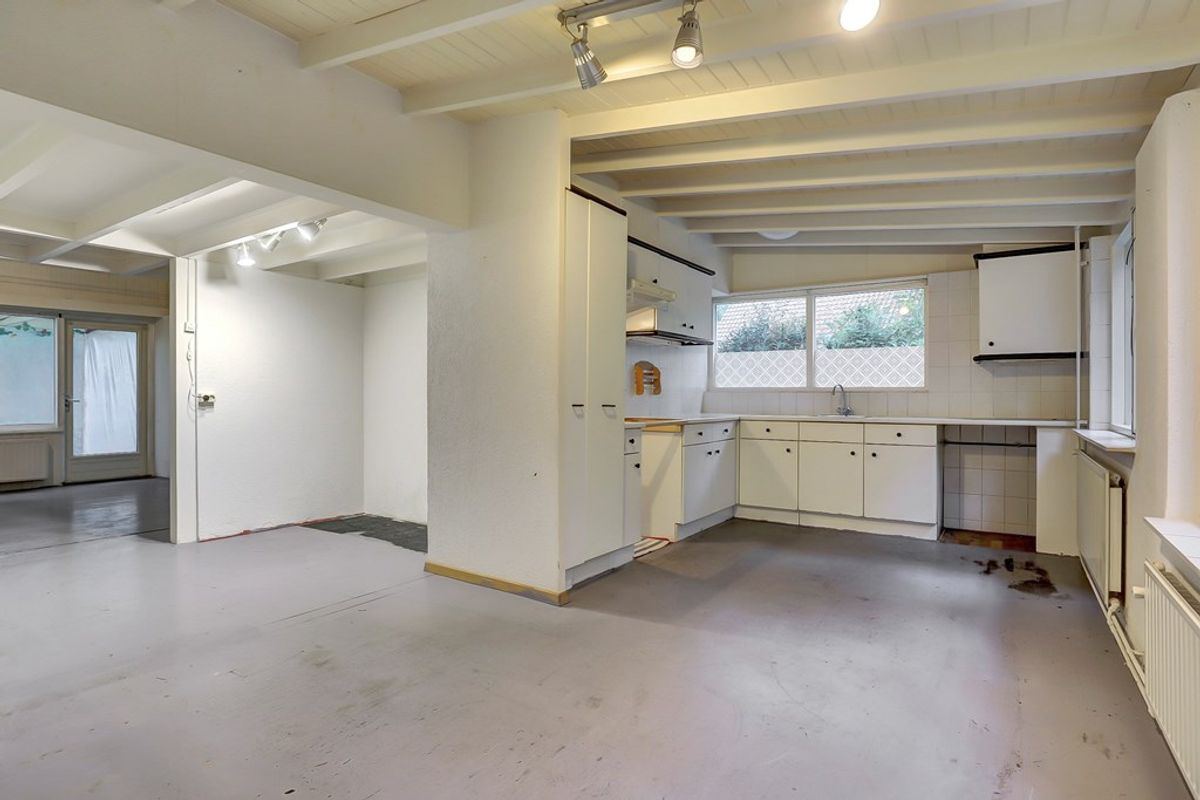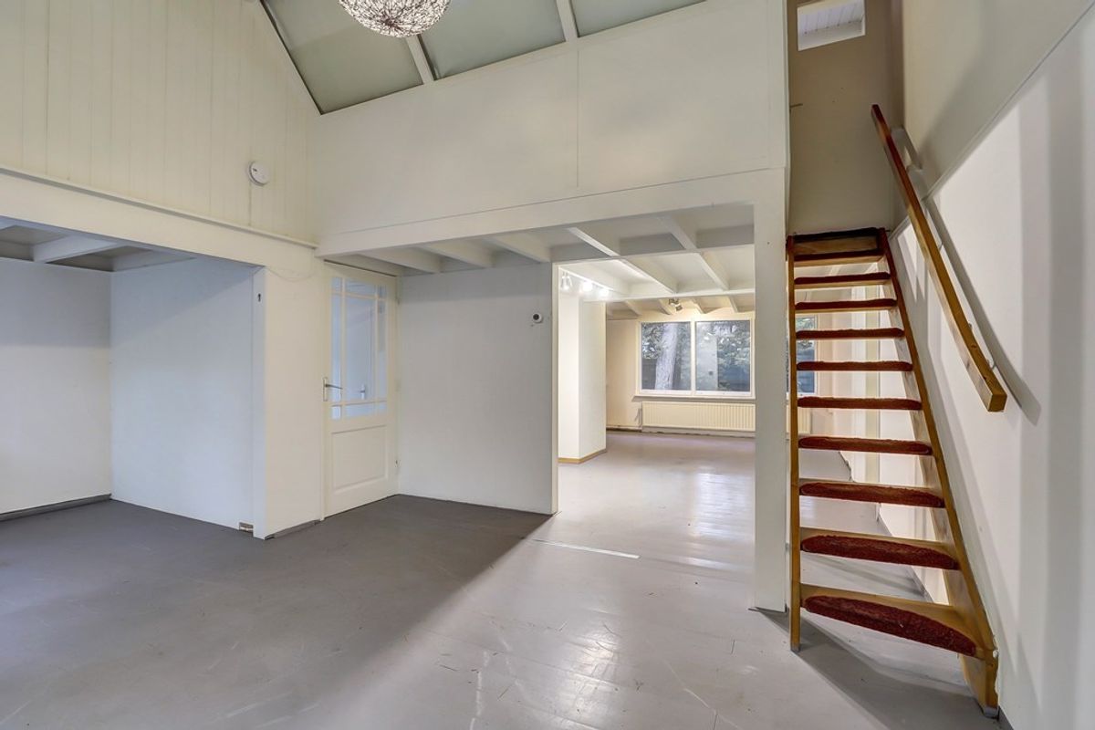 De begane grond bestaat uit een ruime woonkamer met open keuken die enigszins van elkaar gescheiden zijn door de entree in het midden van de woning. De zijkanten zijn volledig voorzien van ramen waardoor er lekker veel licht naar binnen komt en via de woonkamer heb je toegang tot het overdekt terras in de tuin. Het balkenplafond zorgt voor een knusse ‘cottage’sfeer.