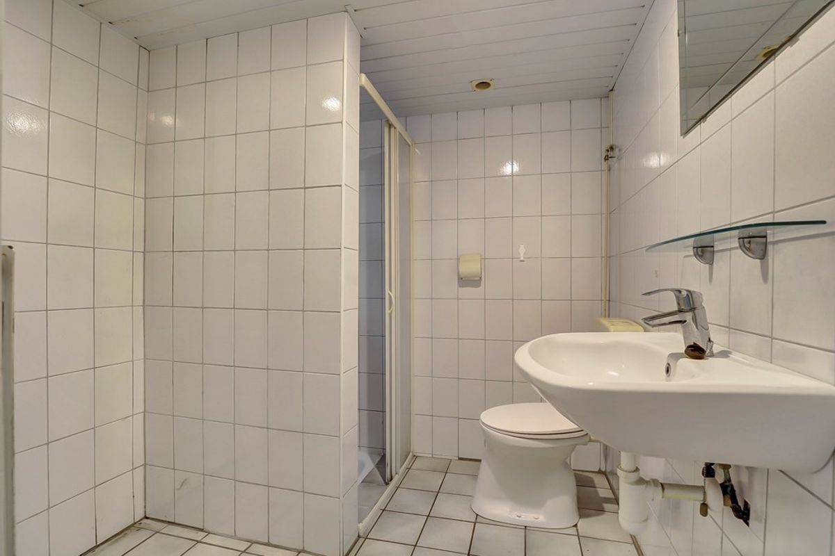 De badkamer bevindt zich aan de linkerkant in de entree. Met een douche, toilet en wastafel is de badkamer eenvoudig maar functioneel ingericht.